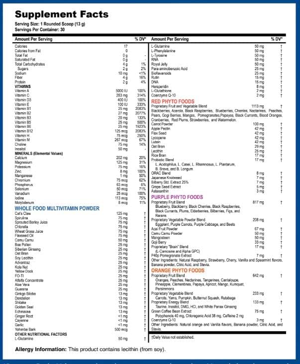 - 100% Vegetarian - Live Food Product & Cold Pressed for Bioavailability - Super Phyto Foods providing Ultra Immune Boosting Support - Whole Food Based Certified Organic Spices, Herbs, and Sea Vegetables - 100% of all Vitamins / Minerals needed for Optimum Health