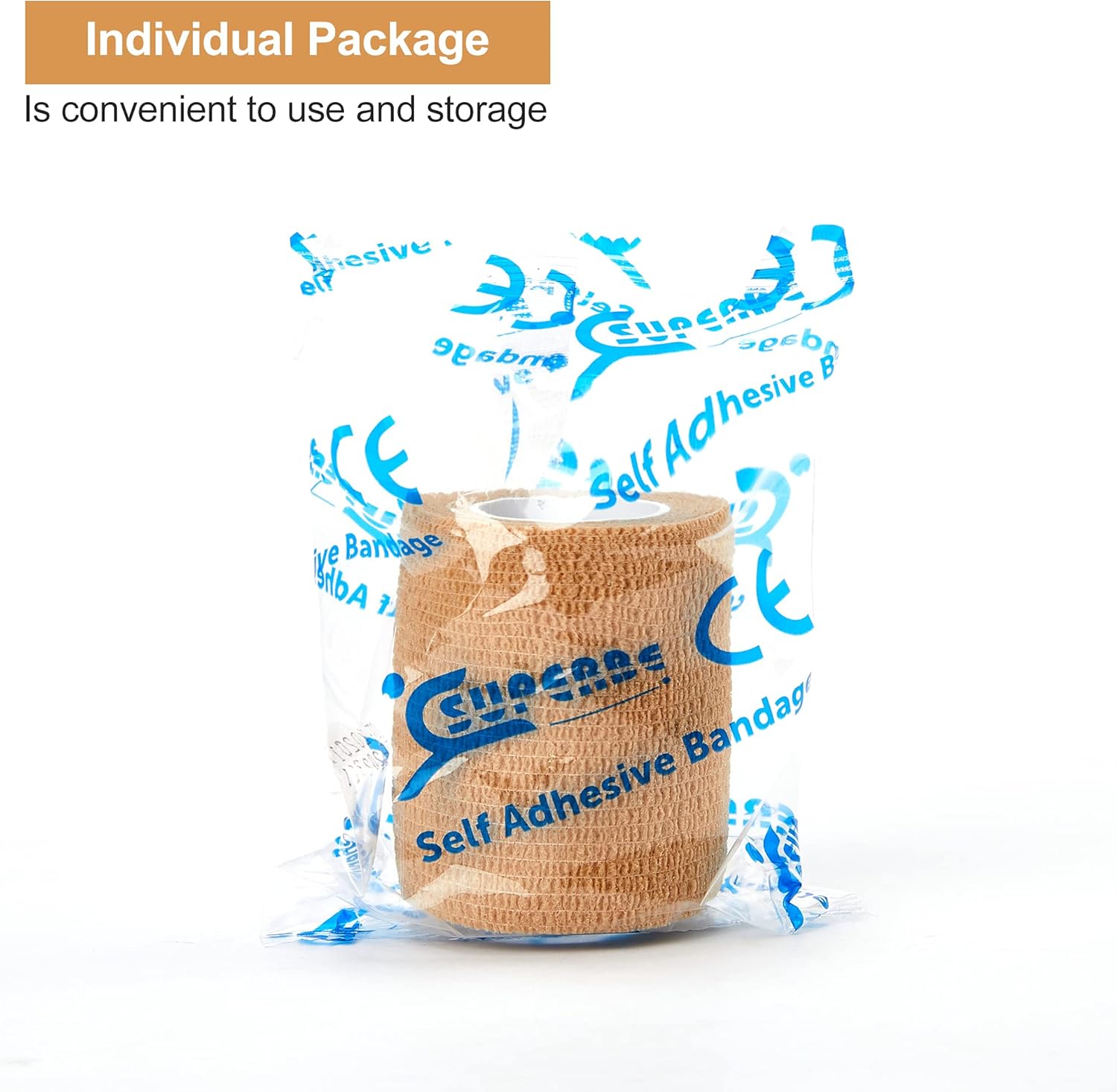 - SELF ADHESIVE - Superbe self adhesive bandage wrap adheres to itself firmly by pressing on it, do not need clips and pins to fix them, and readily torn by hand or by scissors. It's easy to peel it off, without sticking skin and hair. Elastic cohesive bandage give you a comfortable experience.