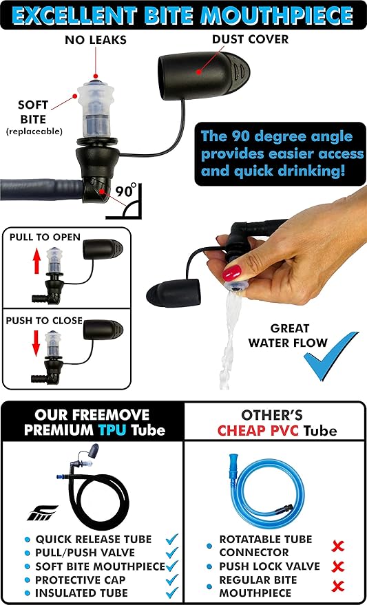 - The 3 liter hydration bladder ads no bad or plastic taste to the water and the large fill hole makes it very easy to clean, the insulated bladder tube has a soft mouthpiece with an on/off shut valve to prevent leaking, will prevent the water from overheating or freezing while hiking