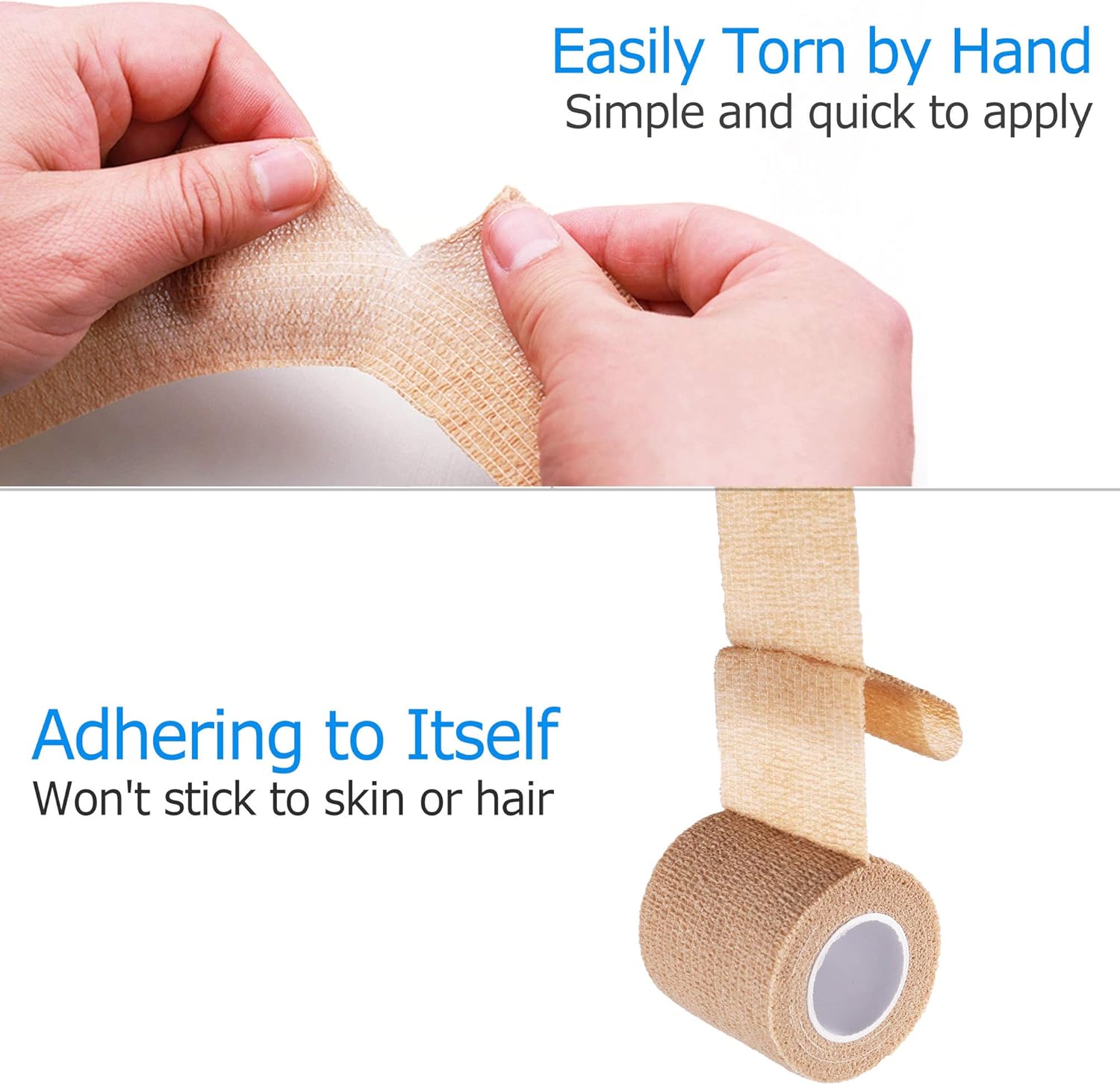 - SELF- ADHESIVE BANDAGES: cohesive tape requires no irritating adhesives and no pins, and will not stick to other surfaces such as skin or hairs; reliable cohesive wrap will not get loose by sweat or water
