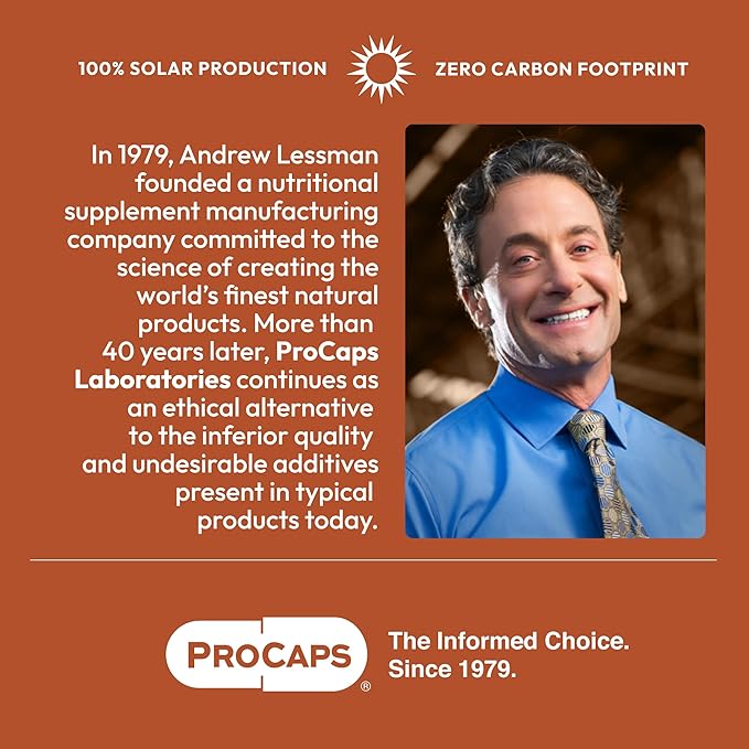 - Ethical & eco-friendly. zero carbon footprint - Uniquely committed to your health and the health of the planet, ProCapsâ facilities are 100% Solar Powered with a Zero Carbon Footprint and an LEED Gold green building status. All ProCaps bottles are made from 100% recyclable post-consumer resin. Plus, Andrew Lessman and ProCaps are the largest donor of prenatal vitamins in the world (over 2 billion capsules donated to date). ProCaps, the Informed Choice for Nutritional Supplements.