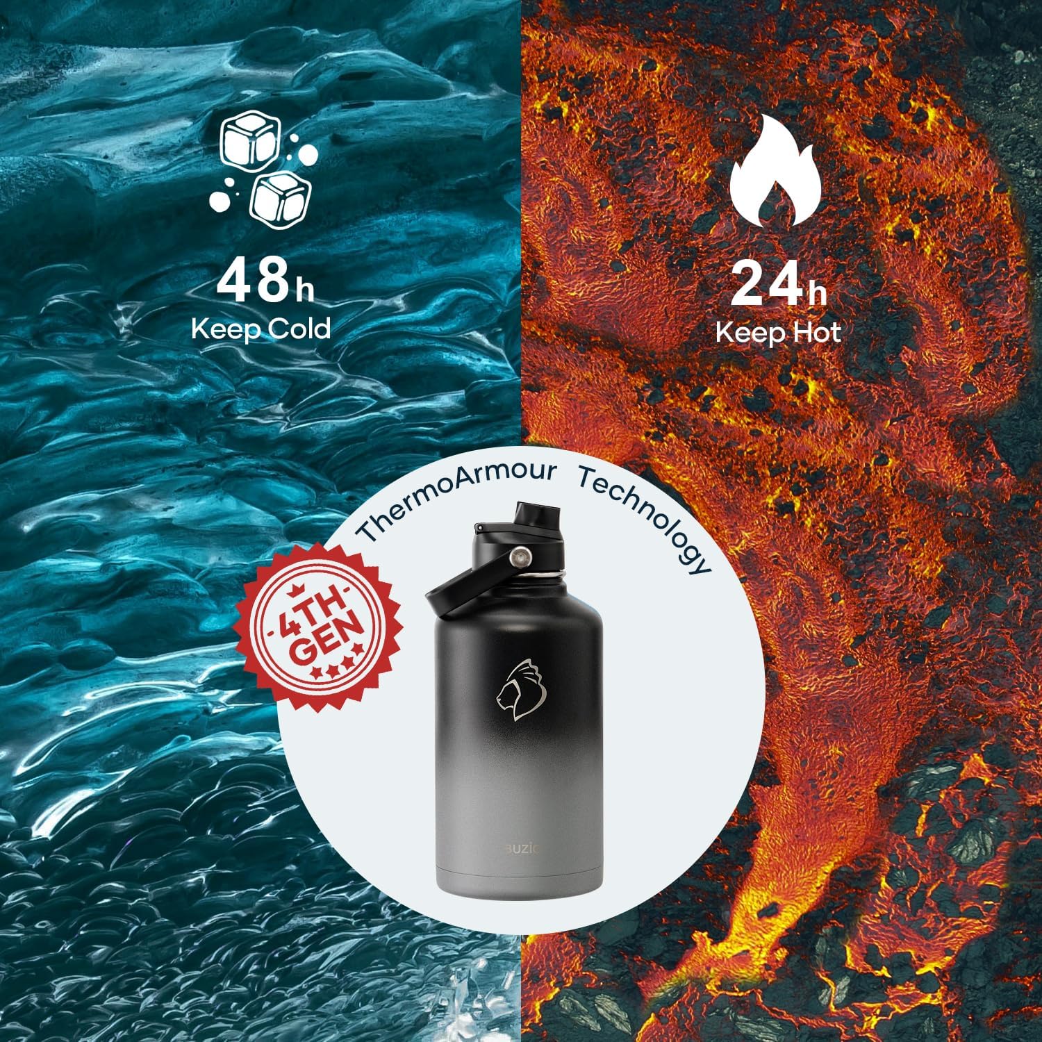 - 64oz Vacuum Insulated Water Bottle: The unique ThermoArmour technology inside this insulated water bottle keeps beverage cold up to 48 hours and hot up to 24 hours