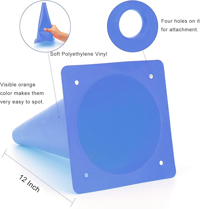 • Size - measures 12 inches in height, 6.7 inches in diameter. Four holes on safety cones for attachment, if it is a windy day, you do not need to worry it will blow all over the place.