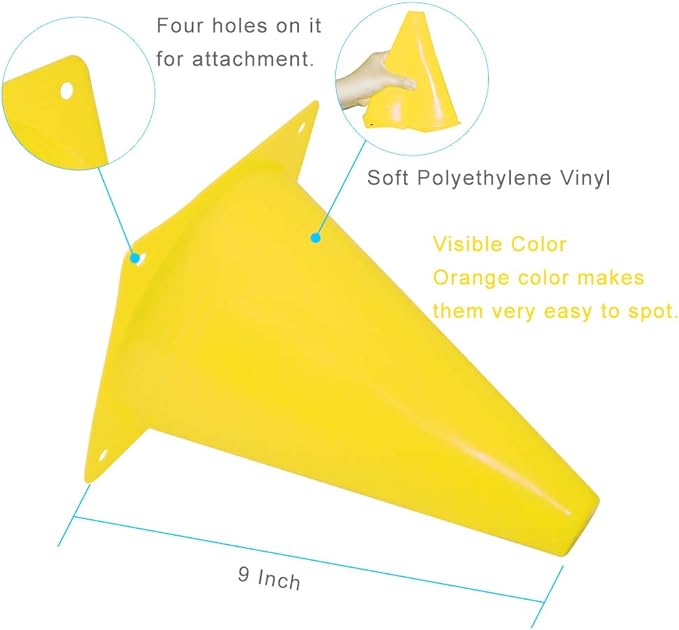 - Size - measures 9 inches in height, 5.5 inches in diameter. Four holes on marker cones for attachment, if it is a windy day, you do not need to worry it will blow all over the place.