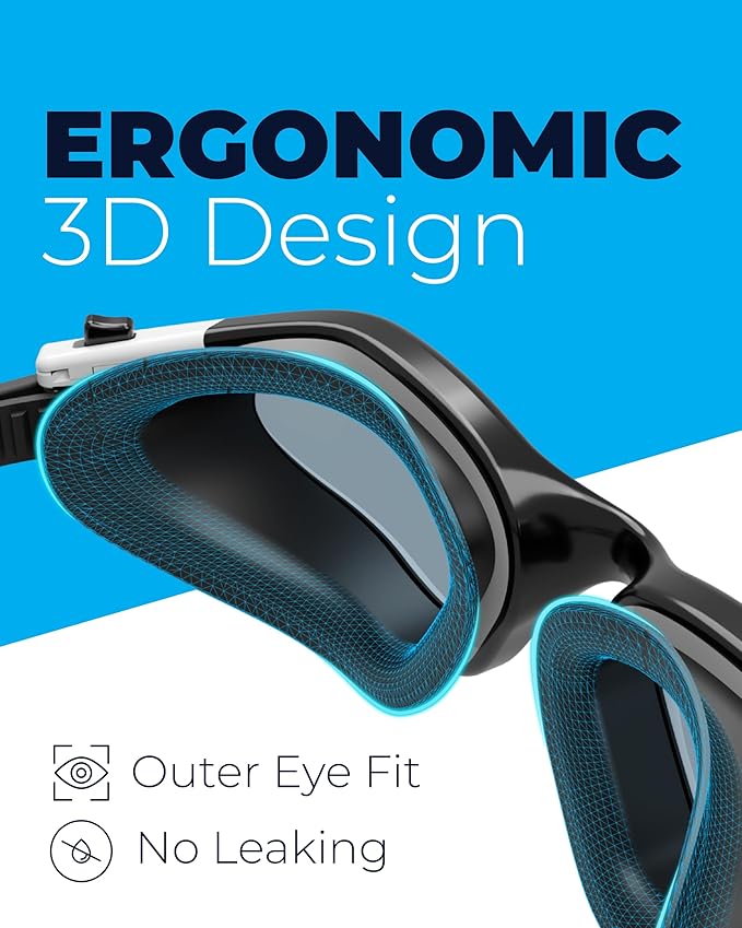 - ✓ MORE COMFORT ~ This swim goggles offer soft & flexible silicone double seals designed to expand and contract to hug the unique contours of a swimmer’s face and achieve the right level of suction without applying excessive pressure around the eyes. In addition, the ergonomic 3D frame design ensures low water resistance and the best fit for a wide range of face shapes, men or women, adults or teenagers