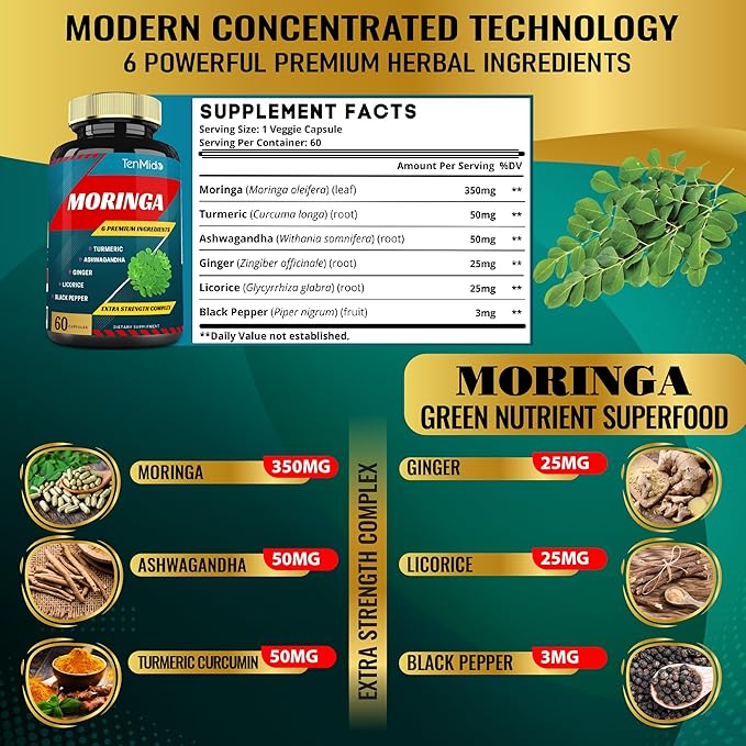 - ❤️ Professional Formula: Tenmido Moringa Capsules combination with 5 powerful herbal problematic ingredients: Turmeric, Ashwagandha, Ginger, Licorice, Black Pepper powder. With the special optimized formula, our product set comes with 2 bottles is harmonious combination of native 6 premium herbs, bring you an energetic fresh life and effect on your health.