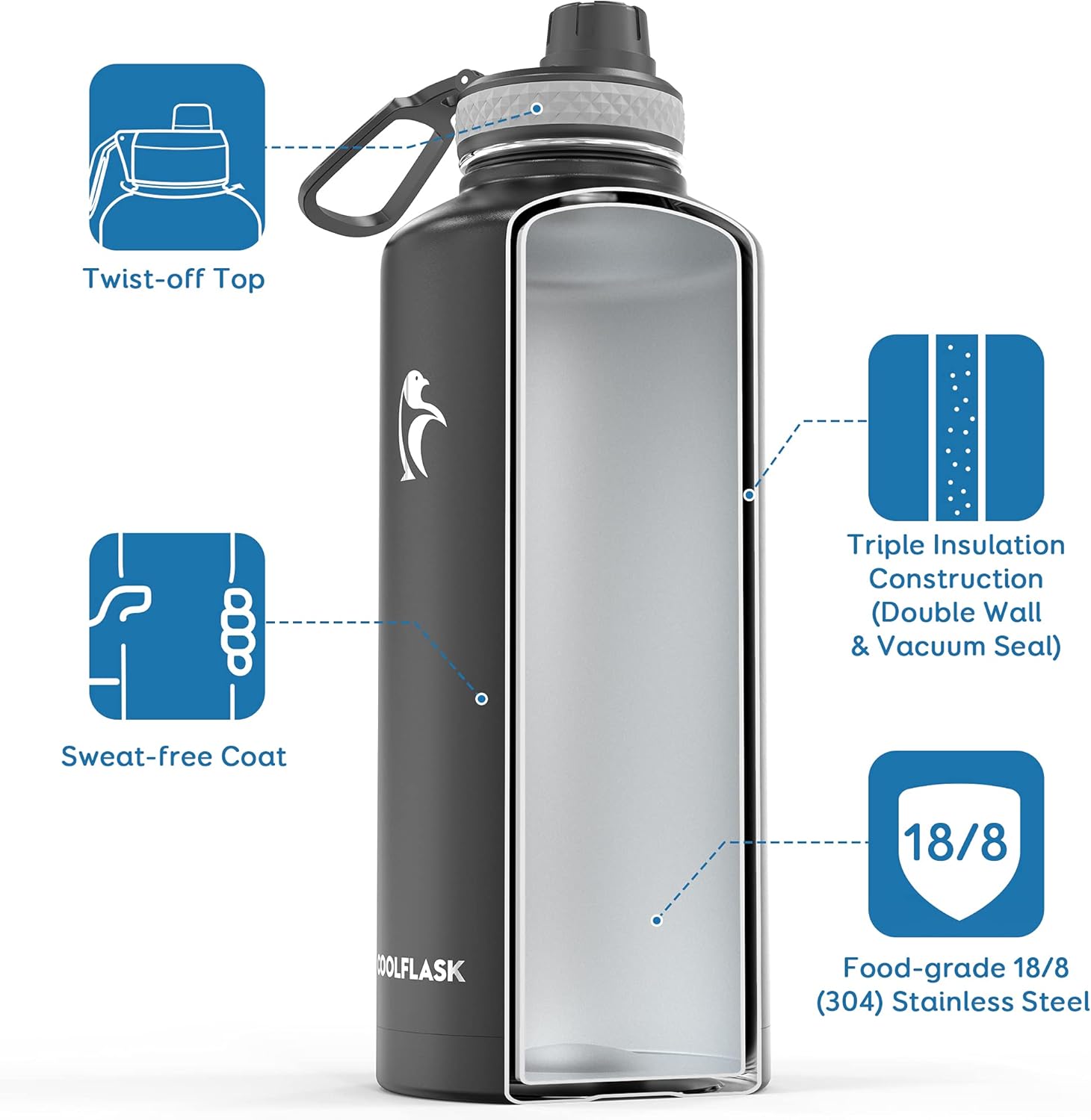 - 48H Cold & 24H Hot: Triple Insulation Technology adopts double wall and vacuum seal, keeps beverages cold for up to 48 hours and hot 24 hours. Anti-sweat coating can keep the surface dry and clean, making it easy to grip.