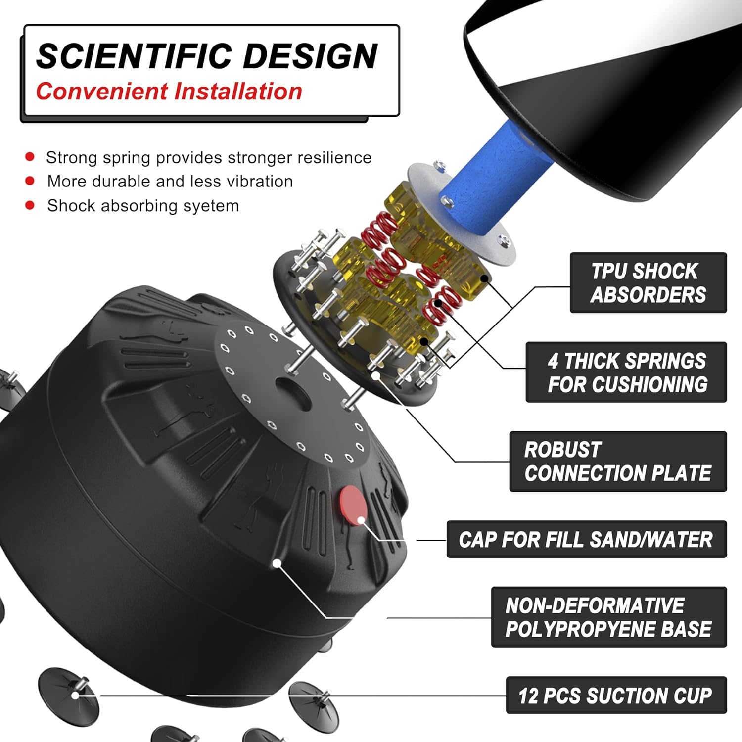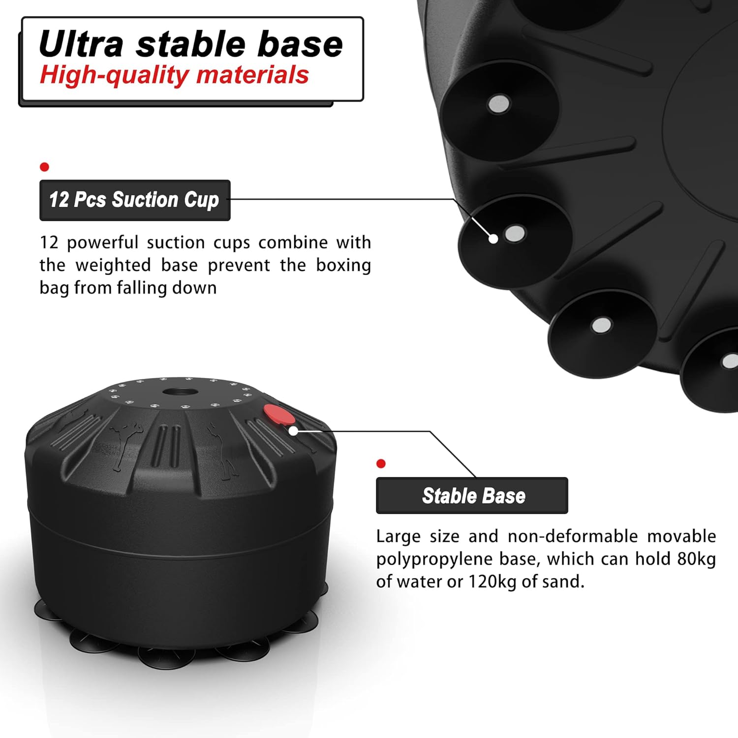 - 【Ultra Stable Base】Large size and non-deformable movable polypropylene base, which can hold 80kg of water or 120kg of sand, there are also 12 pcs suction cups, to provide stable support for the entire boxing bag.