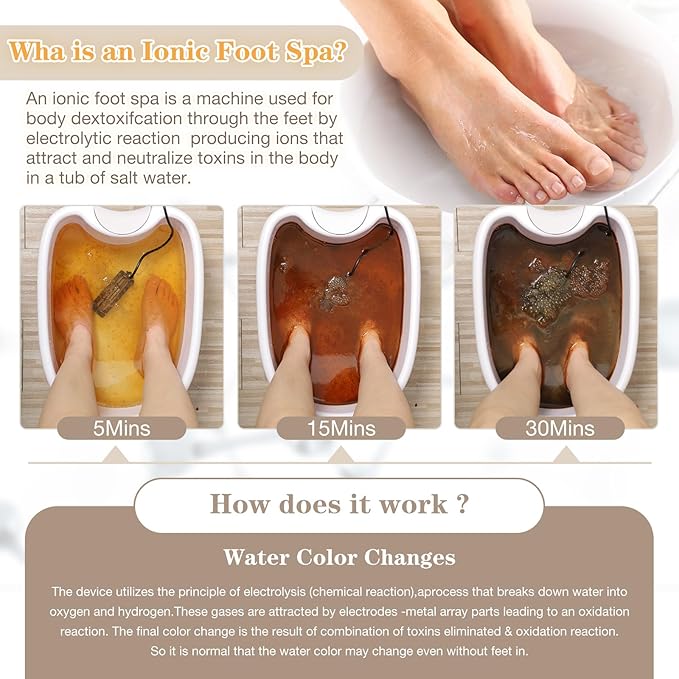 - Warm note: Our ionic foot detox device does react with water and produce color changes, but this is not ‘fake detoxification.The color variation is a natural result of electrolysis: the device uses a mild electric current to electrolyze minerals in the water (such as salts), generating oxidized substances (like iron hydroxide, chlorine, etc.), which cause the water to change color. So it is normal that even without feet, the water may change the color.