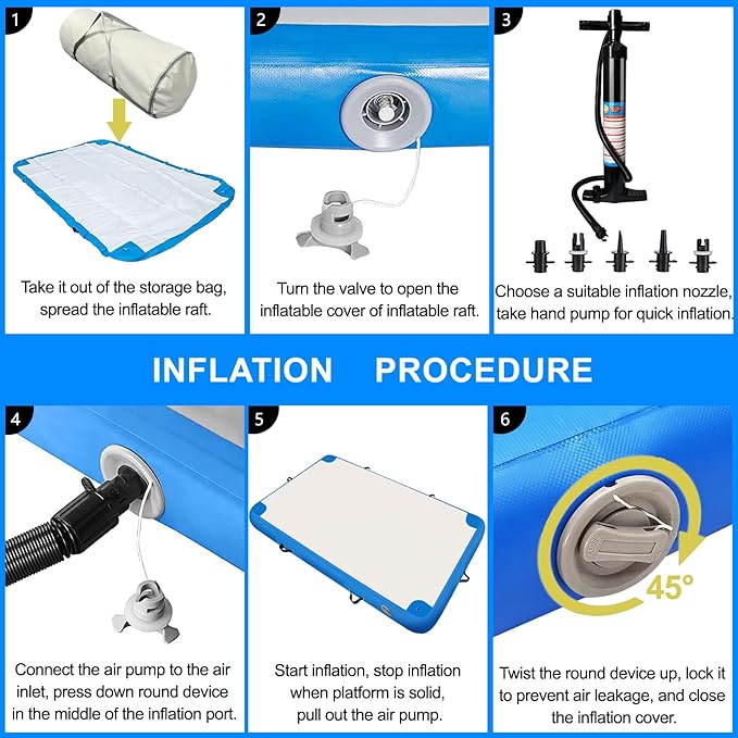 - 【QUICKLY INFLATED & DEFLATED】 We provide a hand pump and a high pressure valves to quickly inflate and deflate the dock for you, bringing convenience to use and saving your time. In addition, the inflatable floating dock also provides a storage bag that is easy to store and carry. Easily pack it up into your car’s trunk for an amazing day out on the lake or drifting down the river!