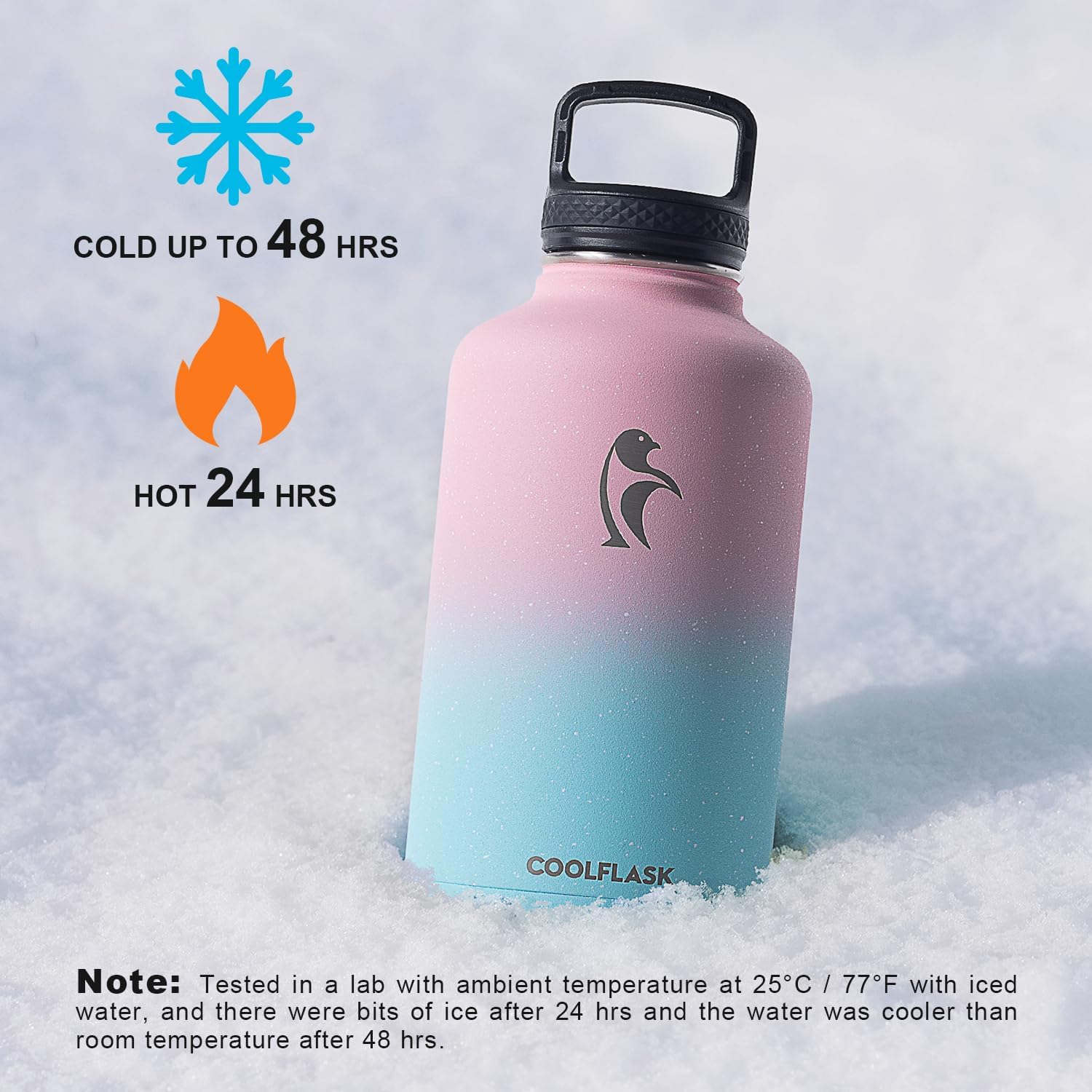 - 【Vacuum Insulated】This half gallon water bottle is made of copper-plated stainless steel with a double-wall vacuum structure, which keeps cold for up to 48 hours and hot for 24 hours so that every drop is refreshingly cool and true to its taste.