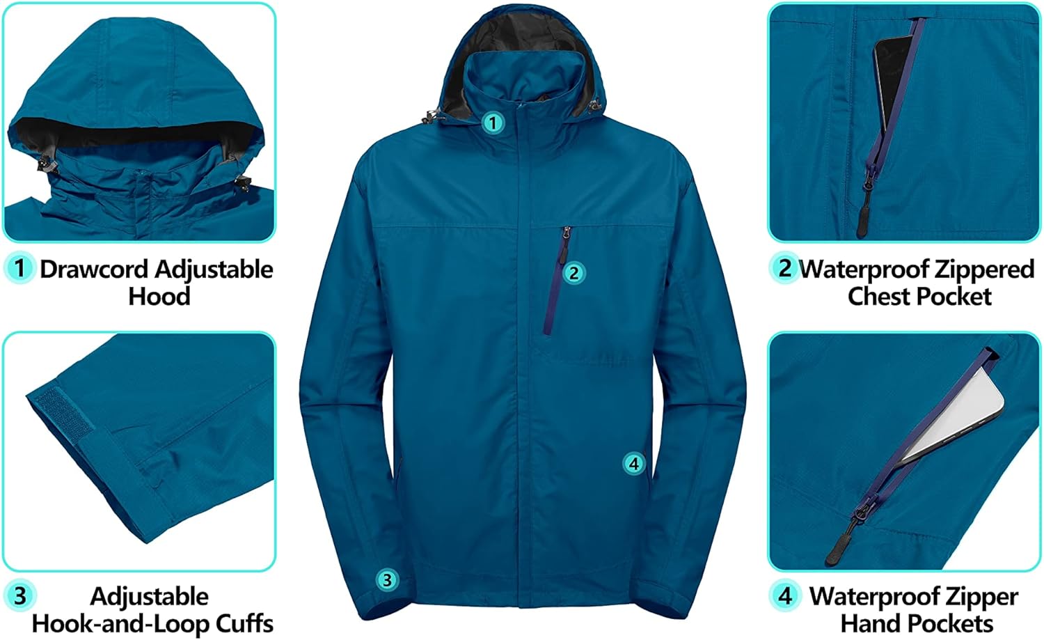 • HANDY FEATURES: â‘ Attached hood with adjustable drawstring; ②Hook-and-loop cuffs and drawcord adjustable hem block out wind and provide a flexible fit; ③ 2 zip hand pockets and 1 zip chest pocket and 1 inside pocket; ④ Zip hand pockets and chest pocket with WATERPROOF ZIP protects items from getting wet