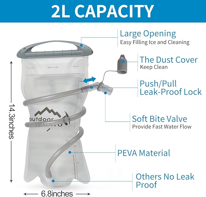 • 🚴‍【Premium Quality Water Bladder】The Hydration Pack Backpack comes with a 2 liter hydration water bladder and two 250ml soft flask. A switch valve and a cover cap make double leak-proof. Large opening allows quick filling of water and ice and it is easy to clean, the water line (40"length,0.4"diameter) provides a wholesome flow for easy drinking keeps your water tasting fresh, all day. The water temperature is range -20~+50℃.