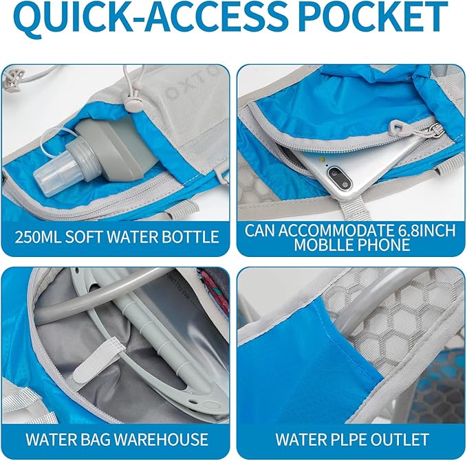 • 🚴‍【Security and Multiple Storage Pocket】Water backpack for hiking Reflective trim for night safety, has multiple pockets can store various necessities outdoor. The bottom front pocket allows you to quickly find what you need during hiking. Smaller quick access items without removing the pack, such as keys, wallet, gadget, sunscreen, phone, towel, or any other items. To travel light, efficient access, let you run faster and farther.