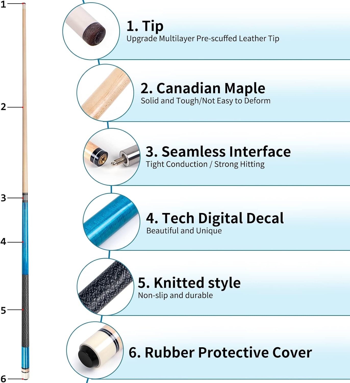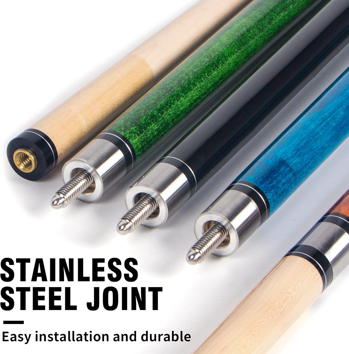 - Canadian Maple Wood:Firm and durable, we have chosen the best quality for the pool stick and the pool cue tips durability. Each pool cue case contains 4 unique pool cues sticks