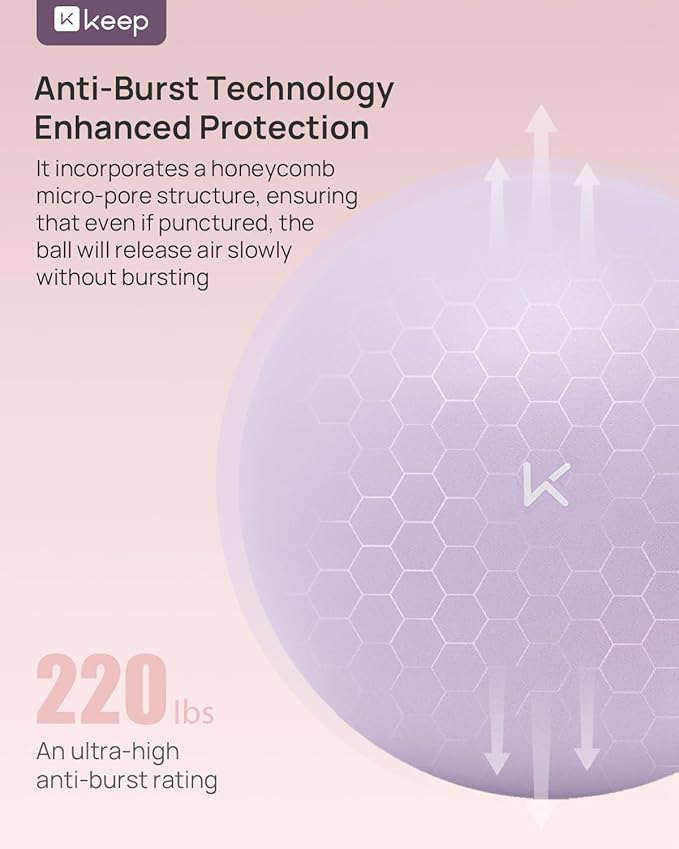 - Anti-Bust & Worry-Free -- The KEEP Fitness Ball features anti-burst technology with a honeycomb microporous foaming structure. It has passed strict explosion-proof test, with an ultra-high anti-burst rating of 1300 lbs. In the event of puncture by sharp objects, the ball deflates slowly rather than bursting, ensuring your safety is always protected