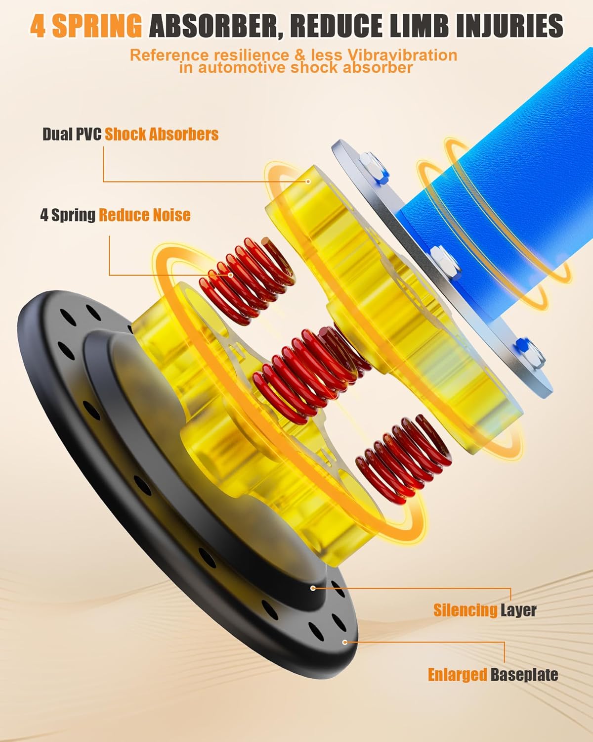 - Shock Absorption : Experience an advanced shock absorption system equipped with dual shock absorbers and 4 springs, delivering a 15-45° quick rebound angle and 360° vibration damping with noise absorption. To intensify strength training, simply remove the springs to reduce vibration absorption and increase resistance.