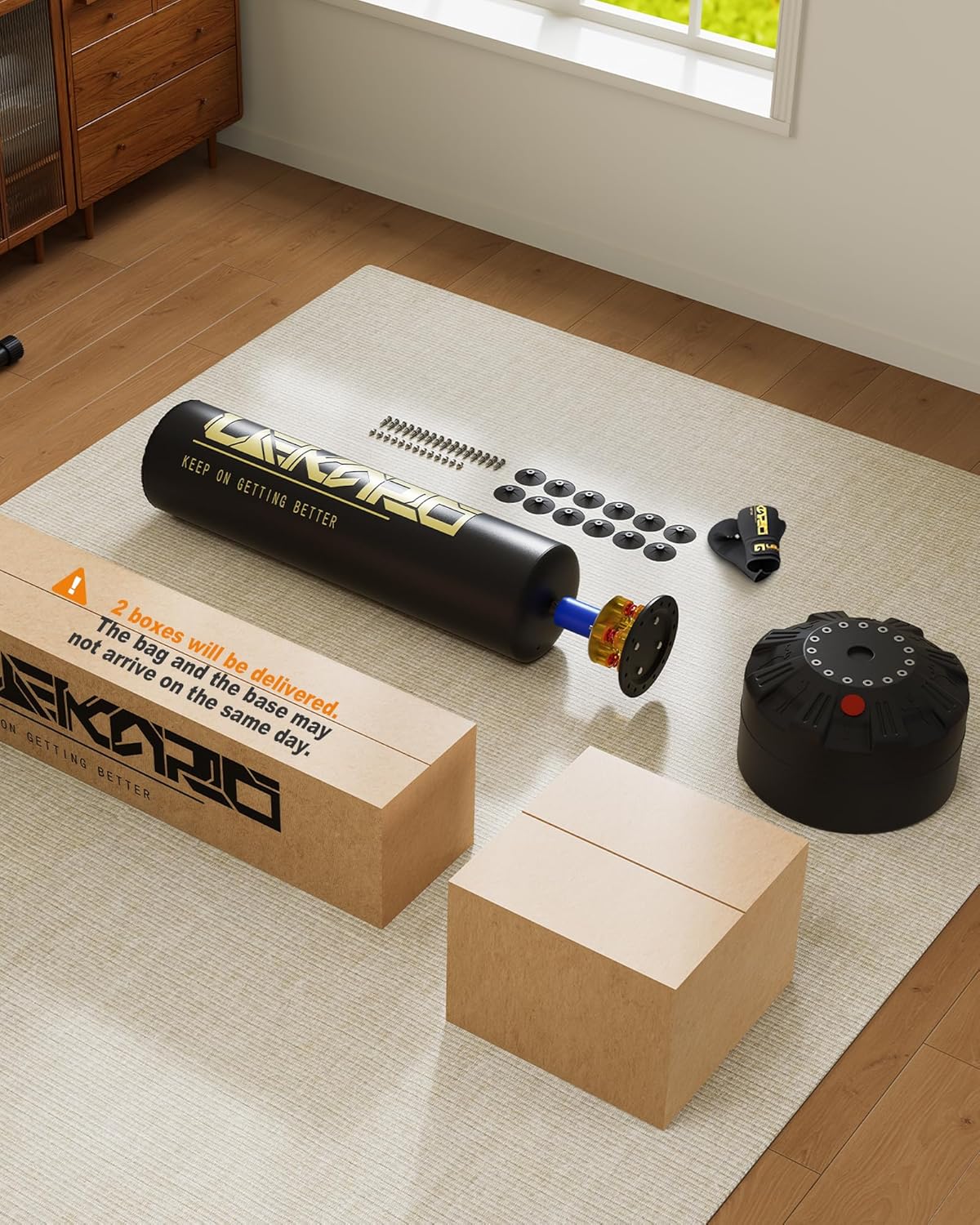 - Punching Bag with Stand : a complete set of boxing equipment, a freestanding punching bag and a pair of 12OZ boxing gloves. You will receive two packages separately. Both packages will be shipped at the same time, but may not arrive on the same day.