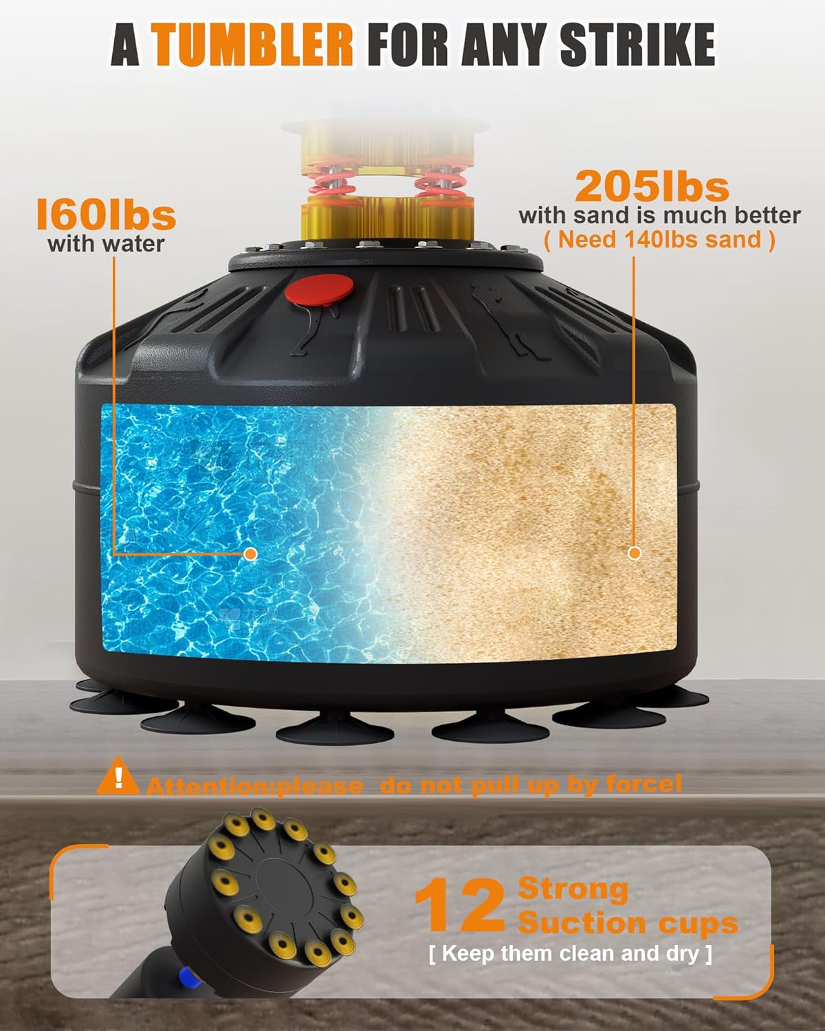 - Stable Base with Suction Cups : Large size and non-deformed removable polypropylene base, can hold 205lbs of sand, it is recommended to fill with sand for more stability than filling with water, placed on a smooth floor so the 12 suction cups can provide strong suction, providing a stable support for the entire boxing bag.