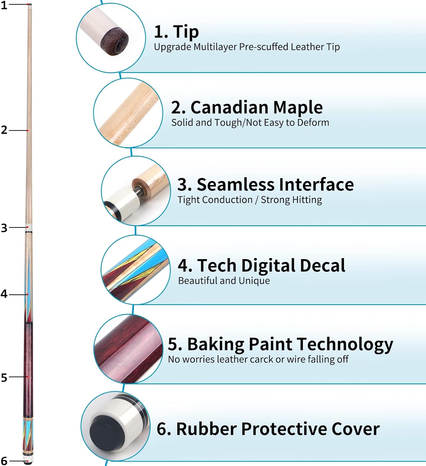 - ✅【HIGH PERFORMANCE POO CUE】-These Pool cue sticks are made of canadian Maple Wood,which is firm and durable, we have chosen the best quality for the pool stick and the pool cue tips durability. You will receive pool cues set of 4.
