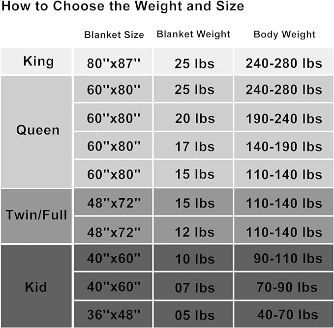 - 【RECOMMENDED WEIGHT/SIZE】 - Please choose 7%-12% of your body weight, which would help you sleep better and faster. We recommend 48''x72'' for twin bed, 60''x80'' for queen bed. This weighted throw blanket not only can be used at sleep, but also can be used while reading, relaxing, or meditating.