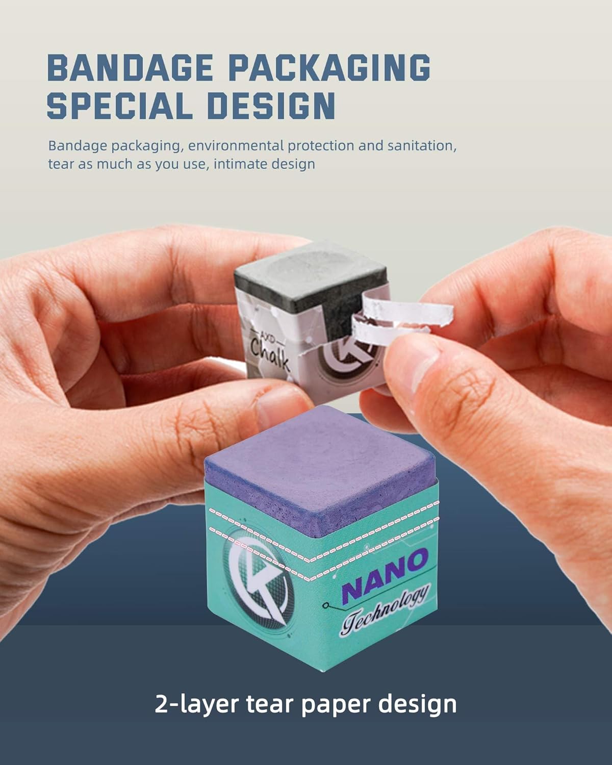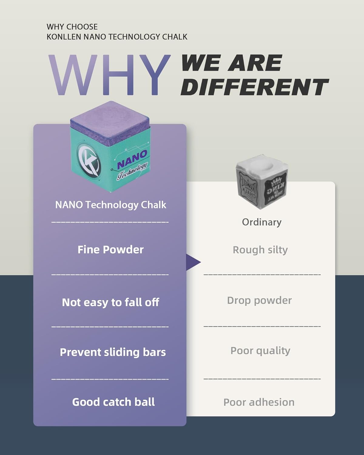 - Nano Technology: KONLLEN pool hand chalk utilizes revolutionary nano-materials, ensuring an ultra-fine texture with superior adhesion. It resists flaking and spreading, making it more environmentally friendly and healthier. With KONLLEN, you can achieve the best feel and performance in any condition.