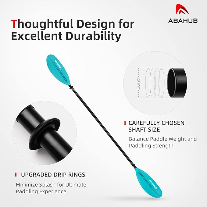 - MADE to LAST: Made of premium quality 1.15mm thick, 29mm diameter aluminum alloy shaft, and fiberglass reinforced polypropylene blades, total weighs 39oz (1100g). This kayak paddle is impact and erosion resistent, thus for great durability. It’s perfect for beginner and intermediate kayakers.