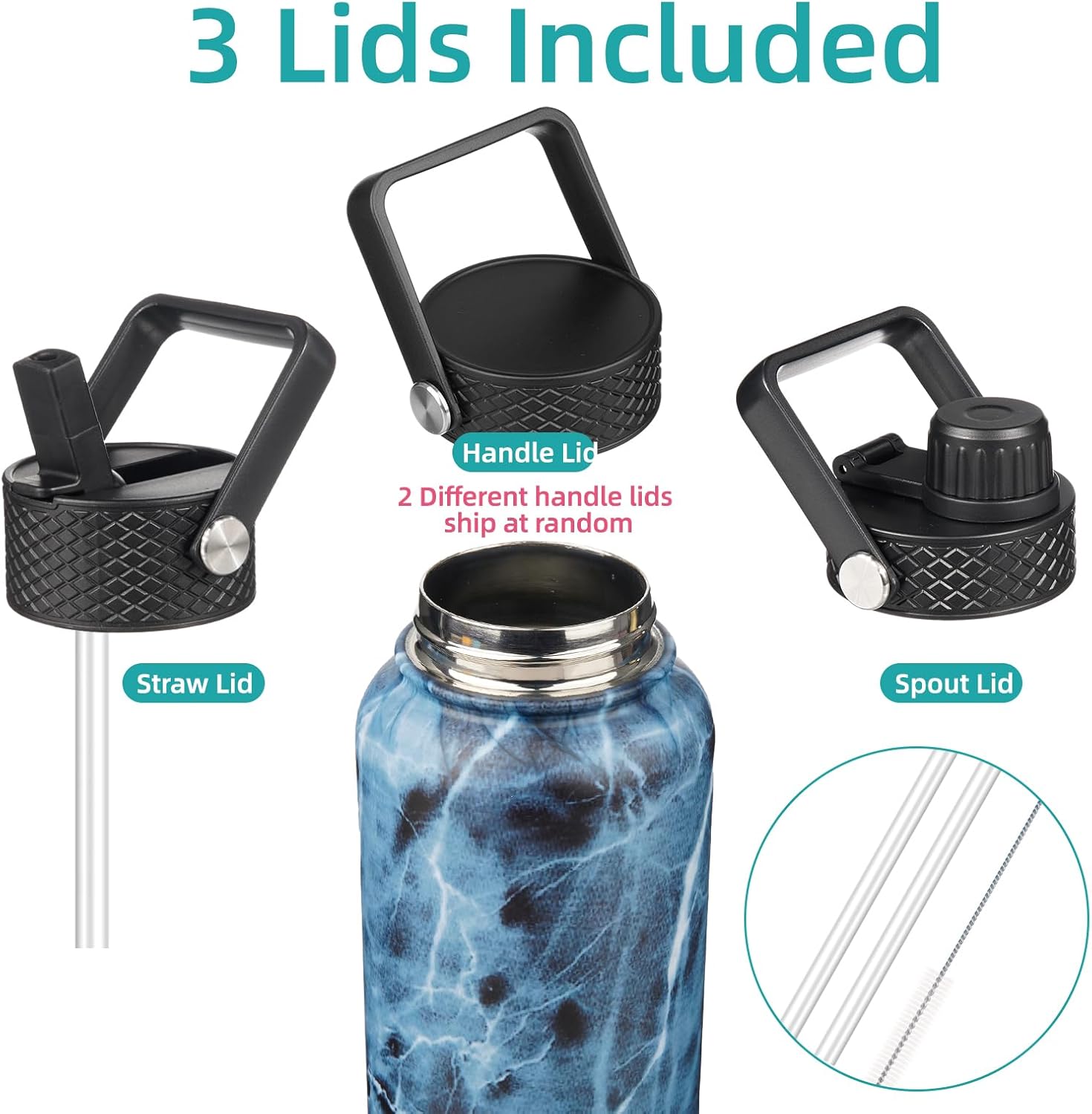 - The water bottle comes with 3 lids for different beverages, a sip lid for hot drinks, a straw lid for iced beverages, a flex-removable lid(2 different handle lids ship at random) for smoothies or fruit drinks. All lids are BPA-free, leak-proof, and dust-proof, catering to your needs