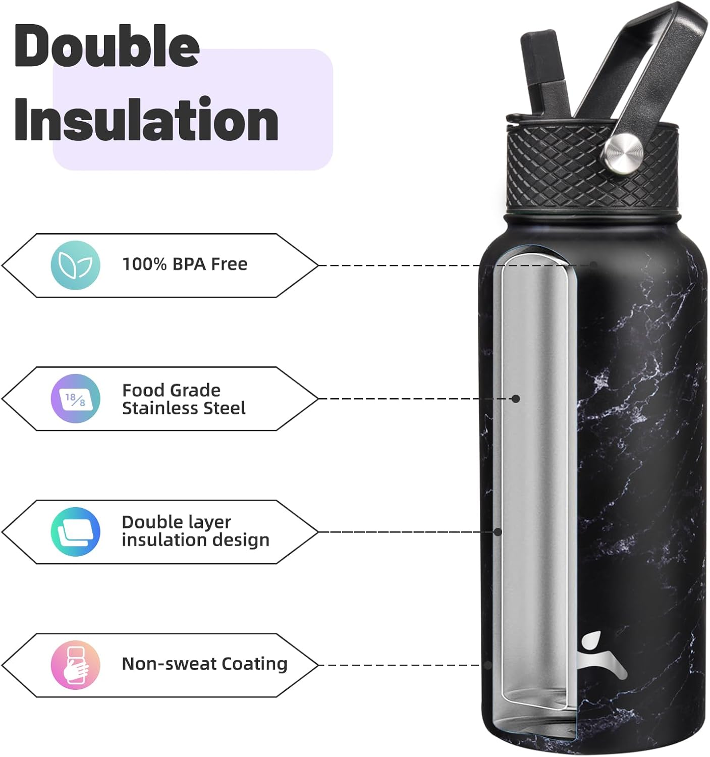 32 oz Insulated Water Bottle Stainless Steel Sport Bottles with 3 Lids,Marble Midnight