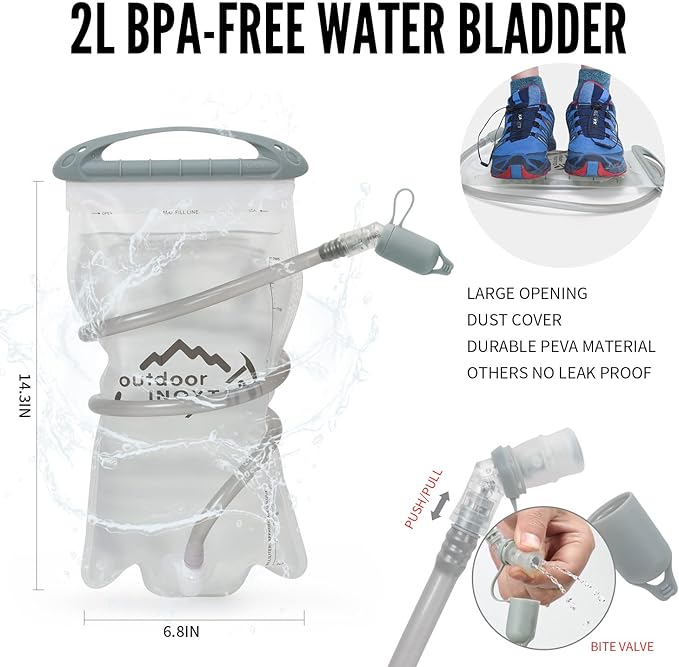 • 🚴‍【Premium Quality Water Bladder】The Hydration Pack Backpack comes with a 2 liter hydration water bladder and two 250ml soft flask. A switch valve and a cover cap make double leak-proof. Large opening allows quick filling of water and ice and it is easy to clean, the water line (40"length,0.4"diameter) provides a wholesome flow for easy drinking keeps your water tasting fresh, all day. The water temperature is range -20~+50℃.