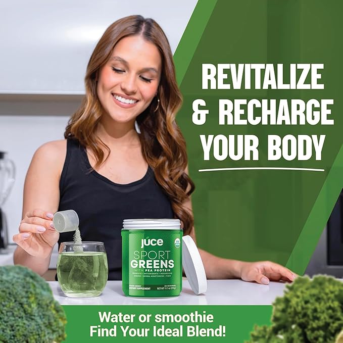 Juce SG7 Sport Greens Powder Supplement | Organic Plant Based Protein | Green Juice Powder | Probiotics | Mushrooms | Mixed Berry Flavor | 30 Servings | By Terra Kai Organics