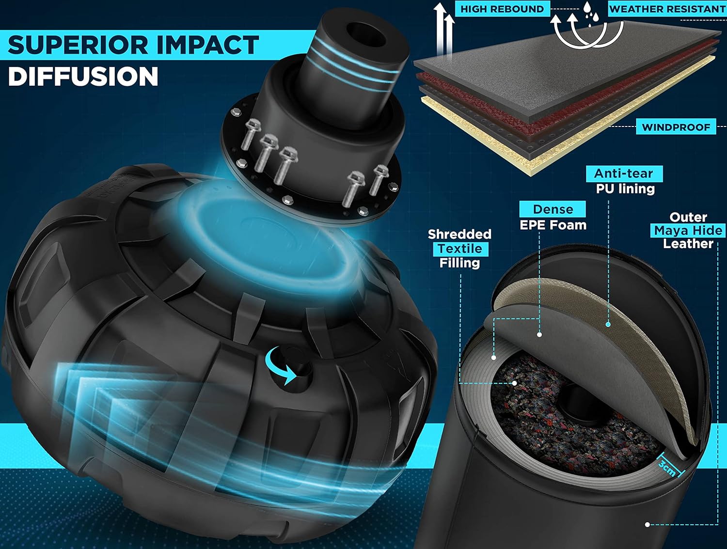 - 3CM THICK ABSOLUTE IMPACT DIFFUSION FOAM– The RONIN free standing kick boxing bag is densely surrounded by 3cm EPE foam that diffuses high-intensity impacts and keeps the shape uniformly even and prevents the bag from deforming when struck with mighty punches or kicks, while the inner shredded textile filling provides a firm and solid punching surface. The impact- dampening base connector keeps the heavy bag stand stable and prevents it from falling.