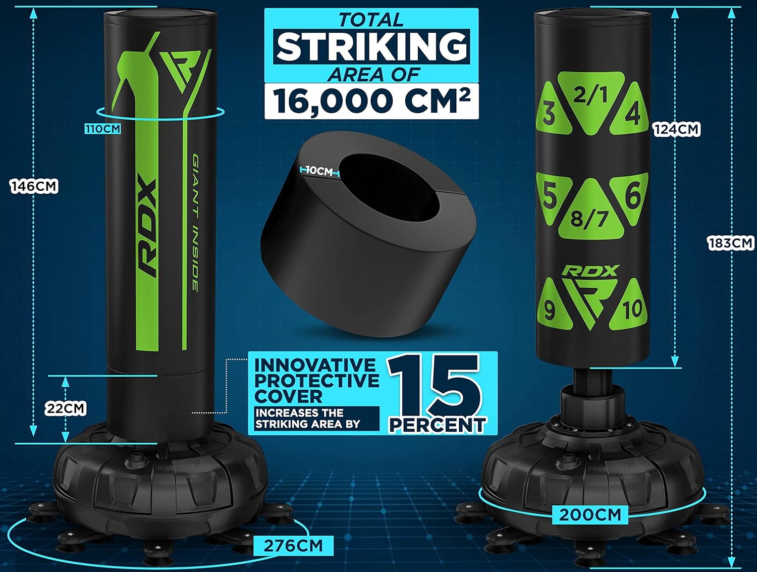 - COMPLETE XXL FREESTANDING PUNCHBAG KIT IN TWO BOXES – Looking for gigantic heavyweight punching bags? The RDX freestanding bags come in two variations, a 6FT version and a 5.5FT version. These heavy-duty punching bags have a large circumference, 110cm for the 6FT and 91cm for the 5.5FT bag and the kits arrive in two separate boxes due to their sizes and weights. Made with anti-rip PU lined Maya Hide leather, the bags offer exceptional durability. Perfect for boxing, kickboxing, MMA, and more!