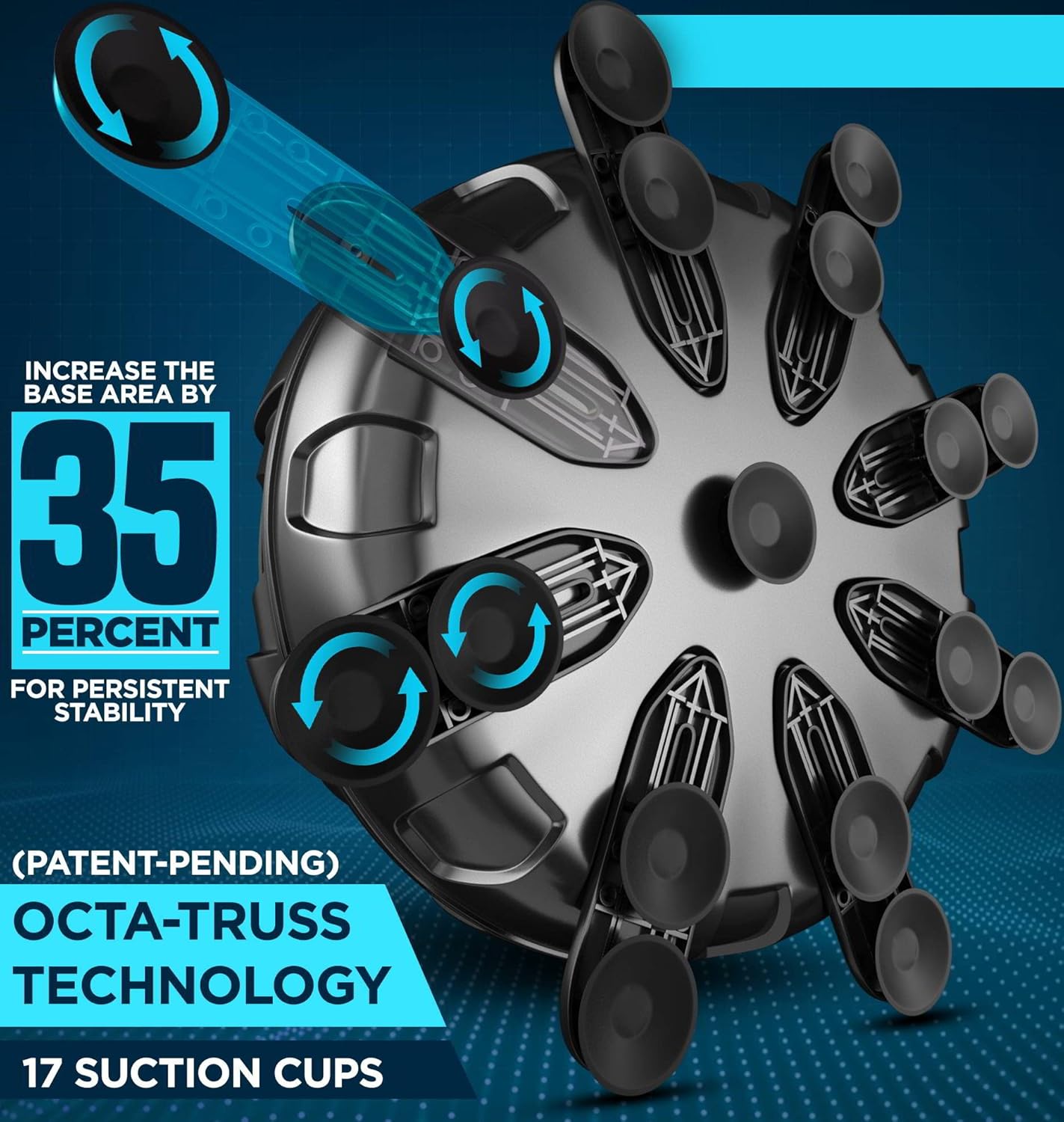 - PATENT PENDING OCTA TRUSS SUCTION BASE– The standing punching bag offers a revolutionary wide octa truss (patent pending) base with 8 extended legs that increase the base area by 35 percent for persistent stability. Each leg features double suction cups and dual rubber pieces for enhanced support, and firmness. The central suction cup of the base along the 16 suction cups for the legs are supposed to be pressed down against a smooth surface to keep the base and legs affixed on the floor.