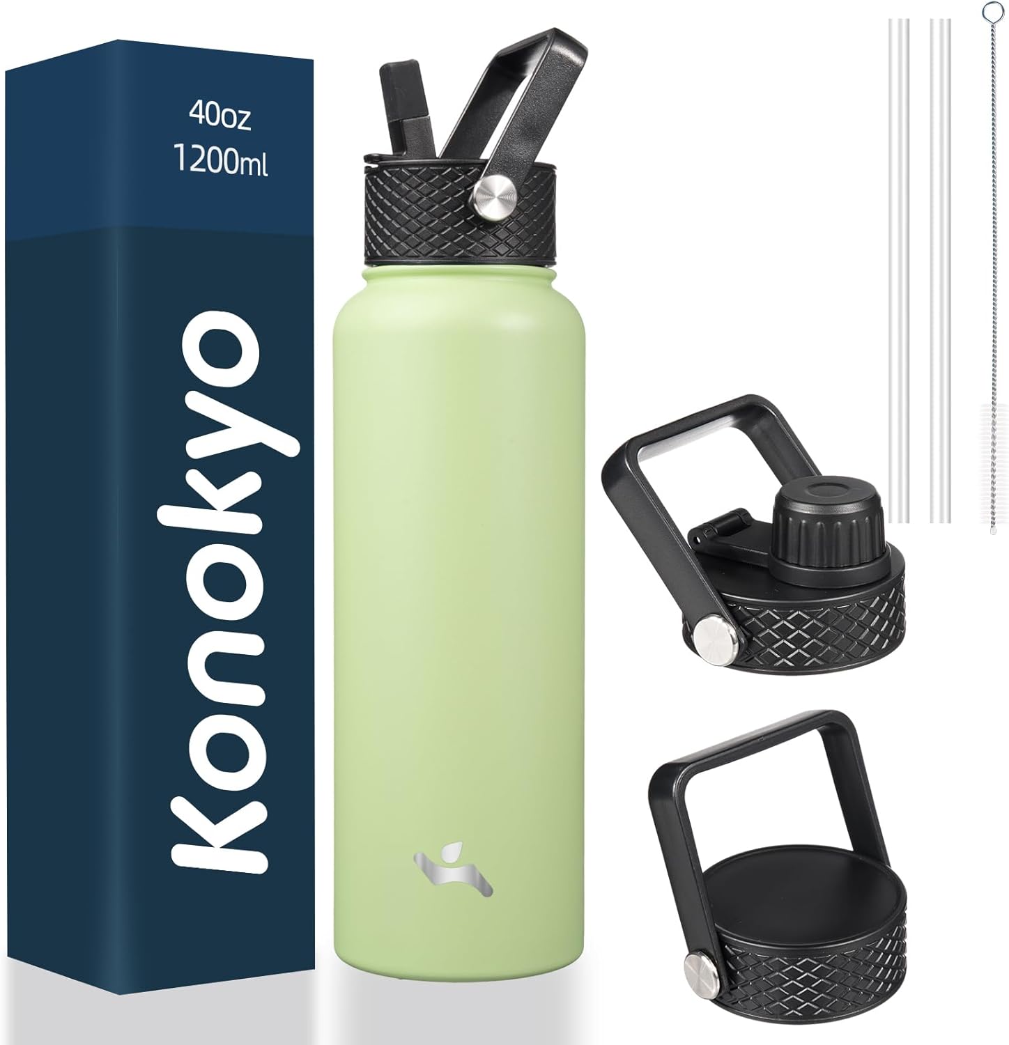 40oz Insulated Water Bottle Stainless Steel Sport Bottles with 3 Lids,Macaron Green