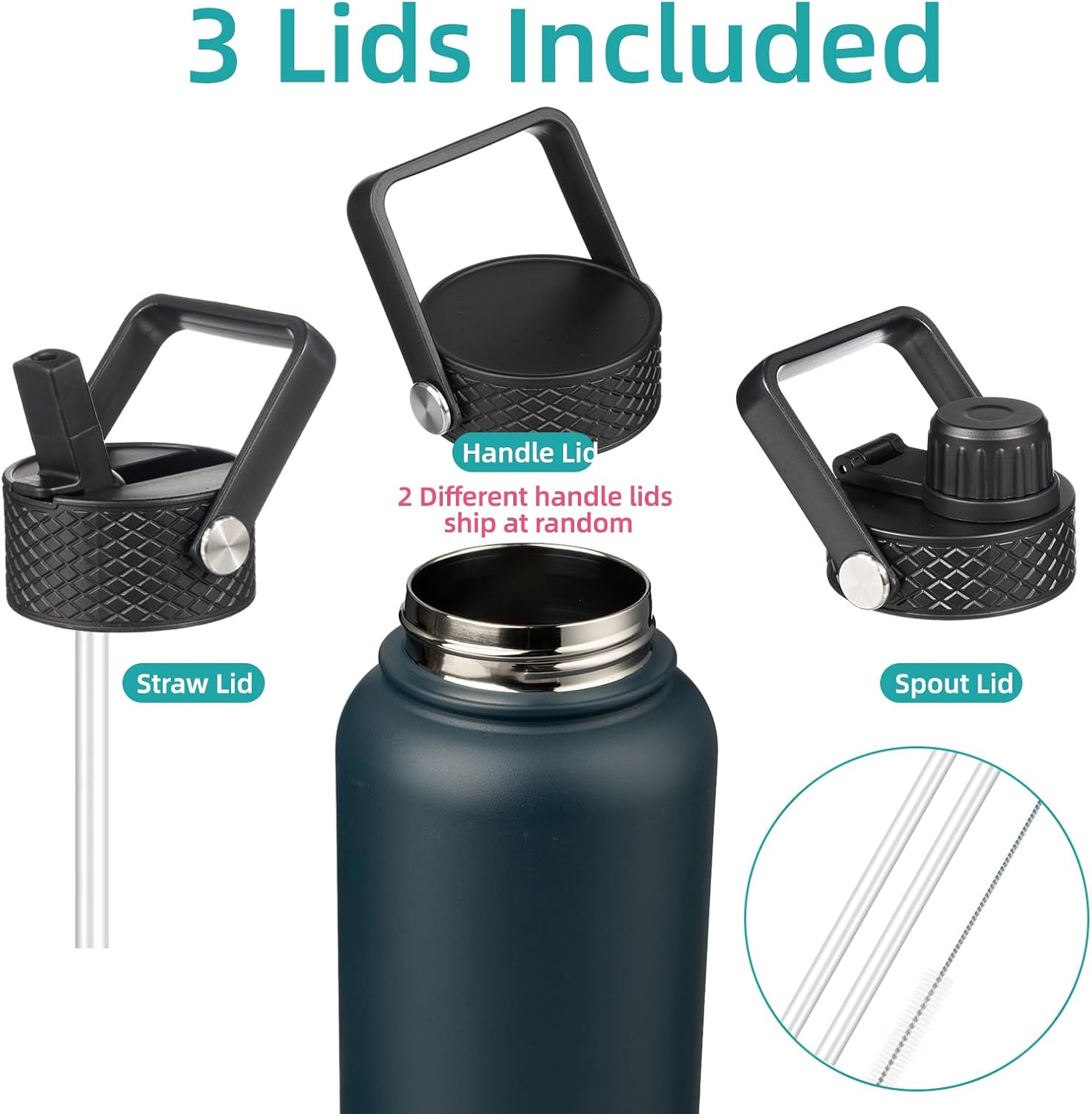 - The water bottle comes with 3 lids for different beverages, a sip lid for hot drinks, a straw lid for iced beverages, a flex-removable lid(2 different handle lids ship at random) for smoothies or fruit drinks. All lids are BPA-free, leak-proof, and dust-proof, catering to your needs