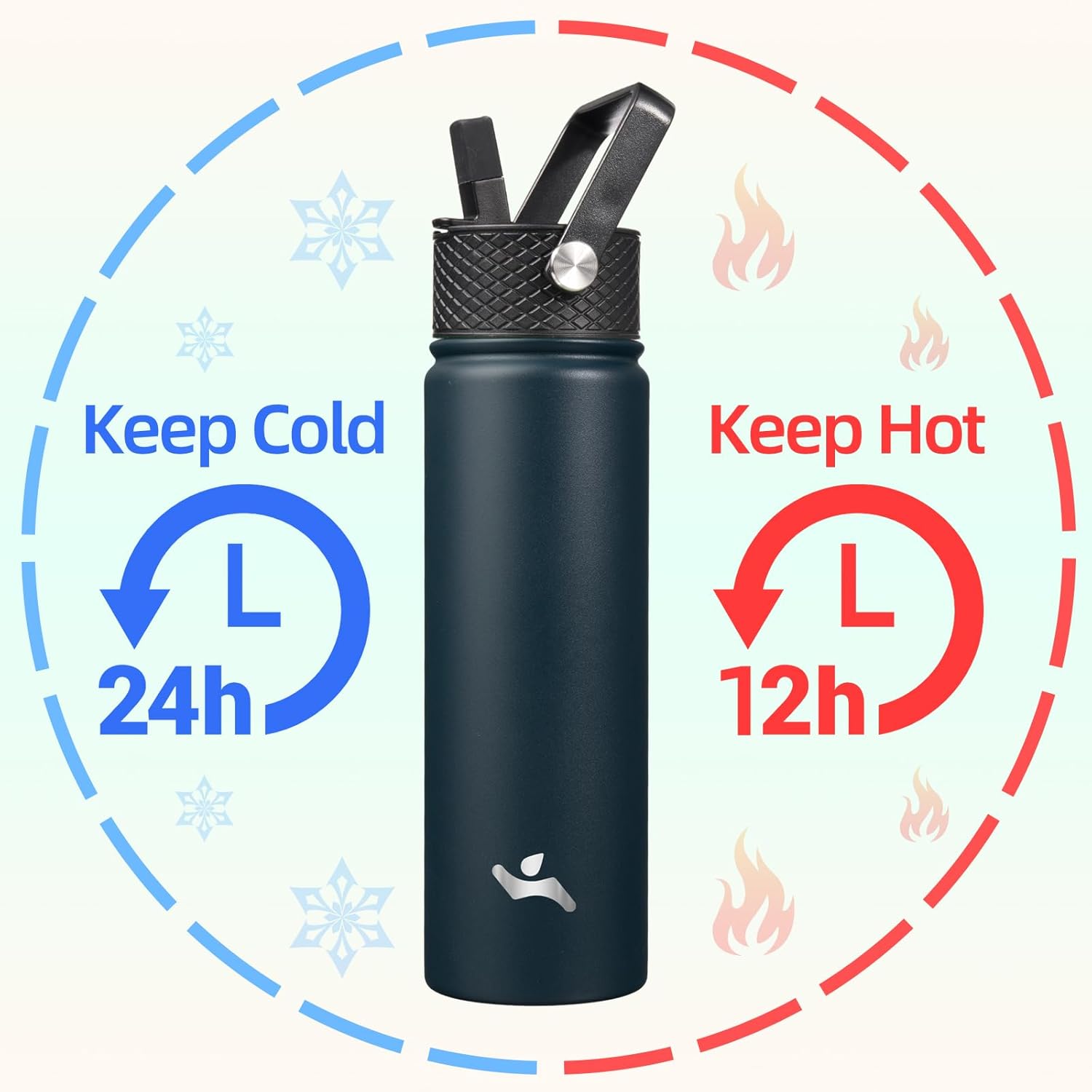 22oz Stainless Steel Bottles with 3 Lids Sport Insulated Water Bottle,Navy Blue