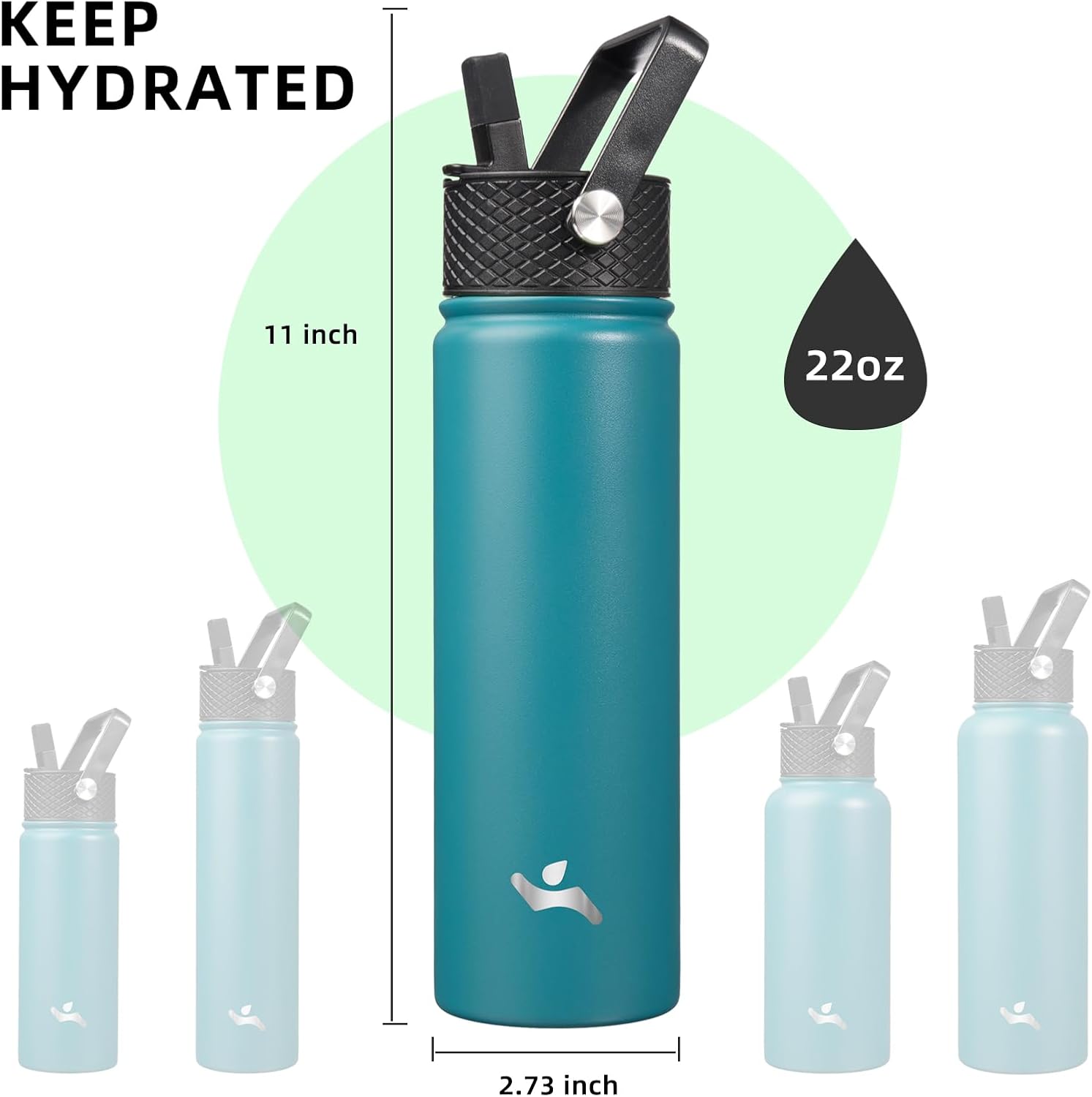 22oz Stainless Steel Bottles with 3 Lids Sport Insulated Water Bottle,Light Blue