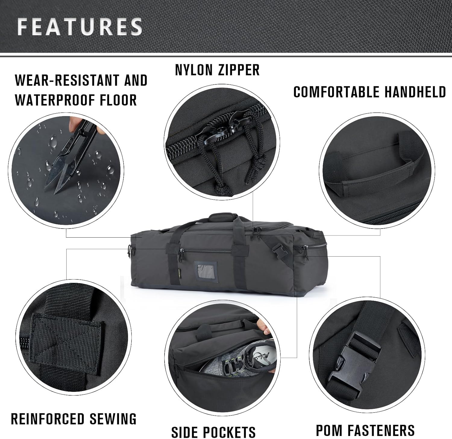 - A VARIETY OF WAYS TO APPLY: Tactical duffle bag design invisible shoulder straps,double-sided increase in hand-carrying straps.military travel bag can be Large duffel backpack, Tote bag,but also two people can work together to transport. The equipment bag has a removable buckle on the shoulder straps, so you can secure the webbing when you carry it on both shoulders, making large bag safer to use.A very useful big weekender bag