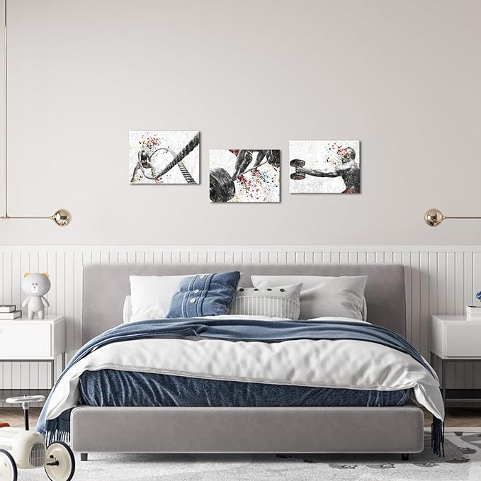 KREATIVE ARTS 3 Pieces Fitness Gym Canvas Wall Art - 12"x16" Framed Workout Prints with Weightlifting, Dumbbell, Barbell & Fitness Rope Motifs, Black & White Sport Painting, Home Gym Decor