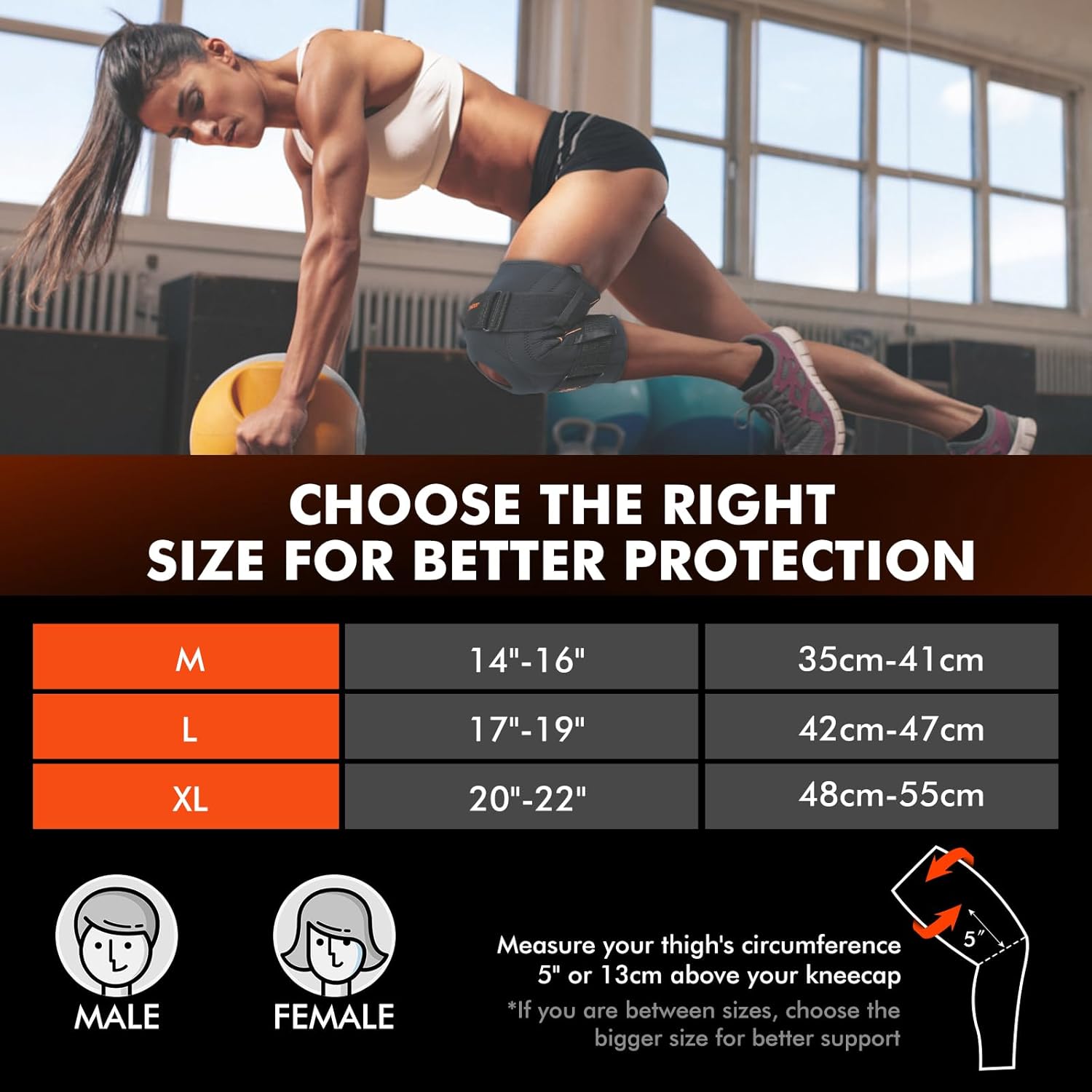 - Adjustable hinge design allows for customizable fit and compression, providing targeted support to the knee joint and patella.