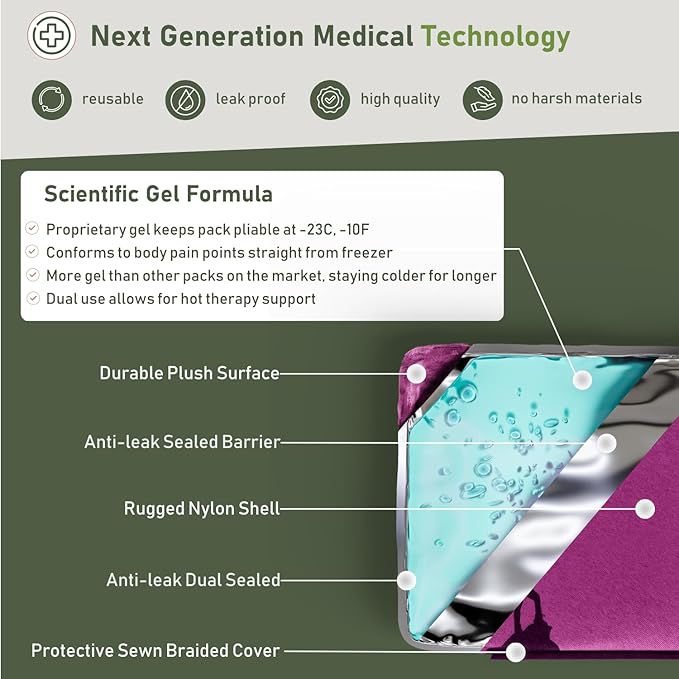- BUILT TO LAST - With our rugged, durable construction, you can turn to our waterproof gel ice packs for injuries reusable. Designed with protective double-sealed seems to prevent leaking, this non-toxic gel pack is a worry-free addition to your pain relief journey.