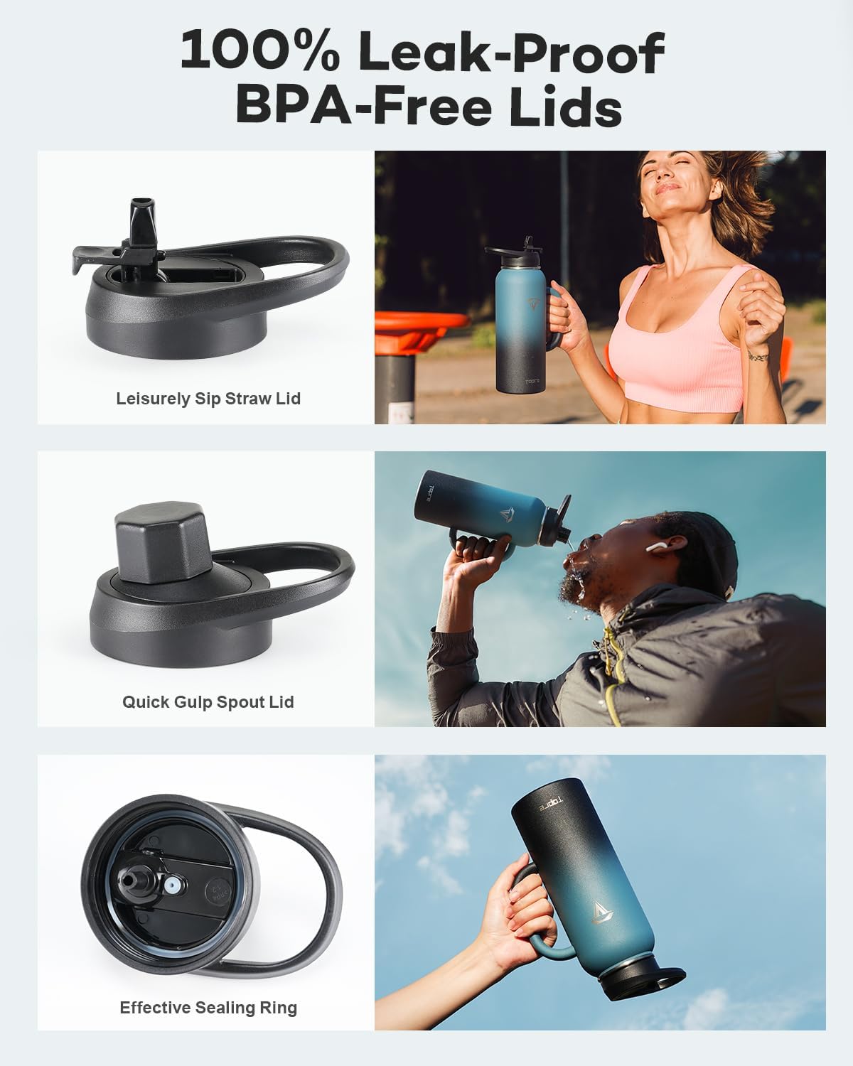 - No Leakage, No Spills: Our stainless steel water bottles comes with a dust-proof flip straw lid and a spill-free spout lid, both 100% leak-proof and spill-proof. The two lids showcase a vibrant color-contrast design, harmonizing with the bottle body's color and adding an extra touch of allure.