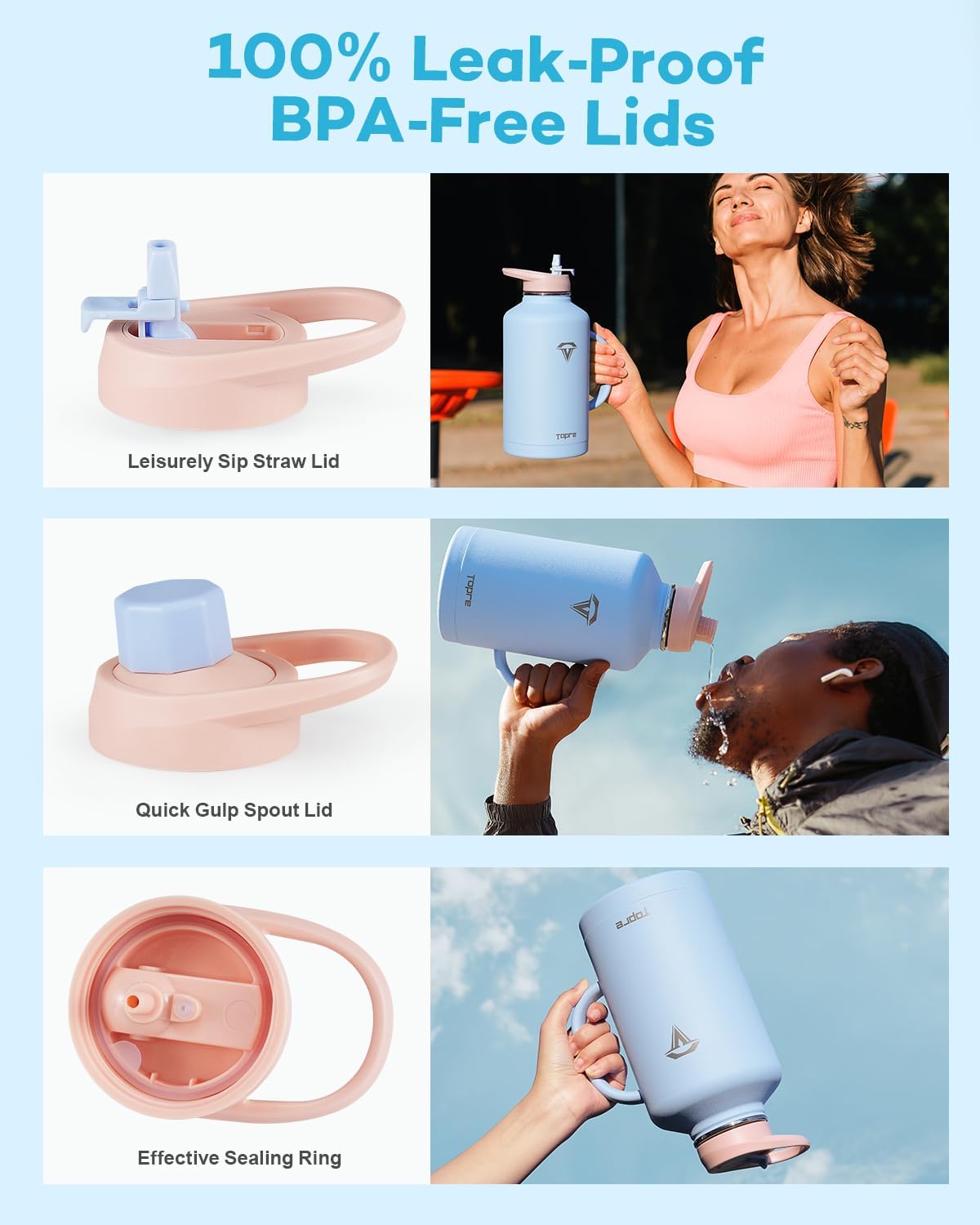 - Hassle-Free Experience: Included with 2 lids, 2 straws, 1 straw brush, 1 bottle brush, and 1 carrying pouch, Topre water jug is fully accessorized to handle any tricky situations. Just choose your style from three capacities (40/64/128).