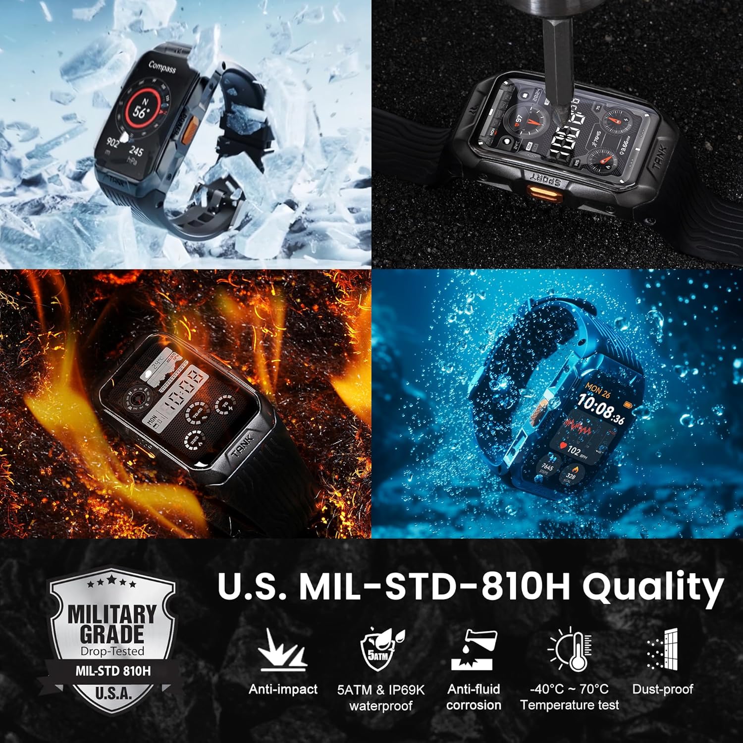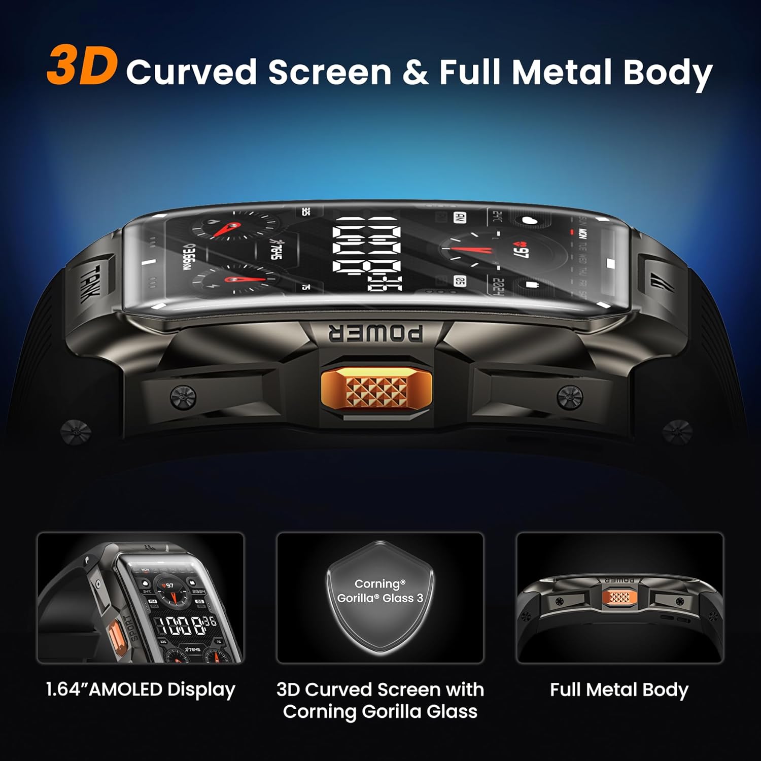 - Military-Grade Designed: The KOSPET X2 smartwatch features 1.64-inch 3rd AMOLED always-on Display with 3D curved glass, which is thick enough to handle a range of screen-breaking behaviors. The rugged smart watch has a fully stainless steel unibody, passed 15 Military Tests(MIL-STD-810H) and 28 Reliable Internal Tests, Including salt spray, rain, impact, etc.