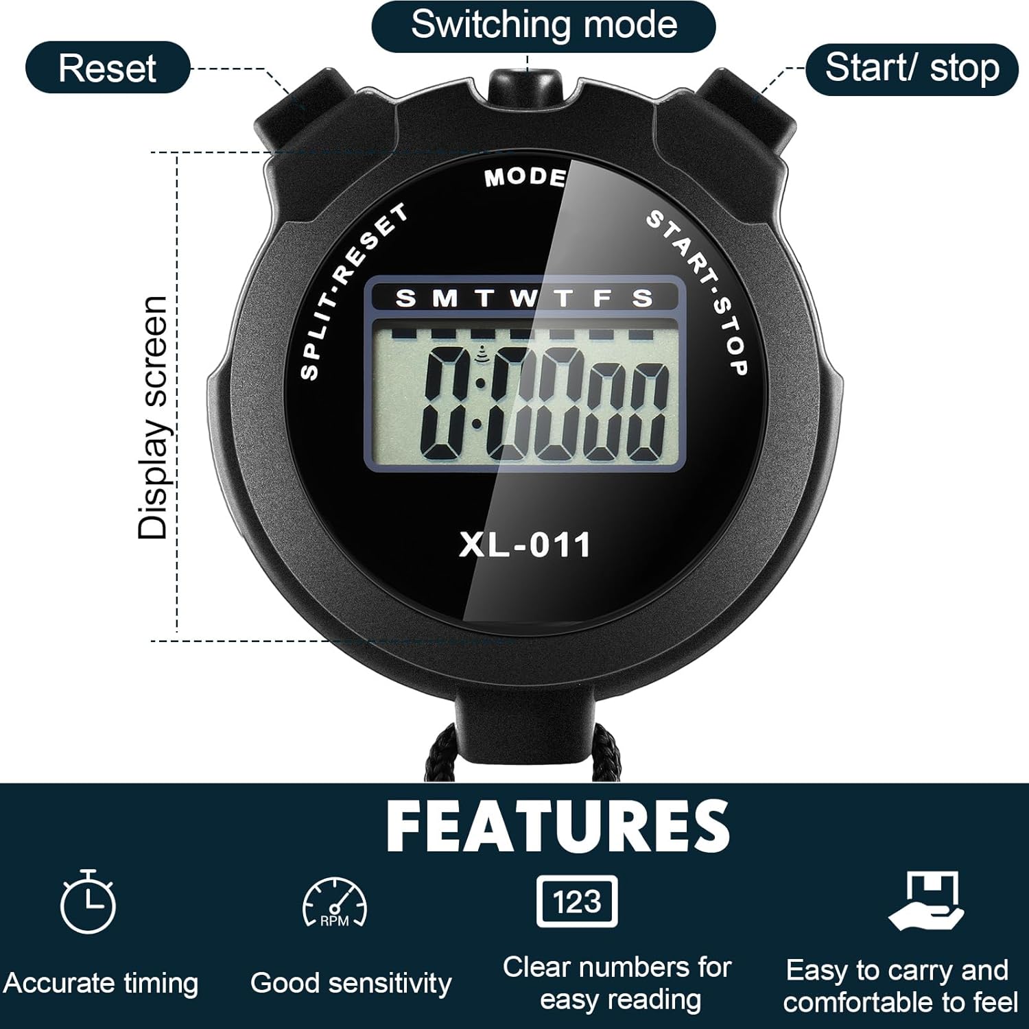 - Convenient Size: the stopwatch timer measures about 2.56 x 2.76 x 0.79 inches/ 6.5 x 7 x 2 cm, lightweight and portable, and each stopwatch comes with a black lanyard tied to the end; You can hold it in hands, put it in your pockets, or hang it around your neck