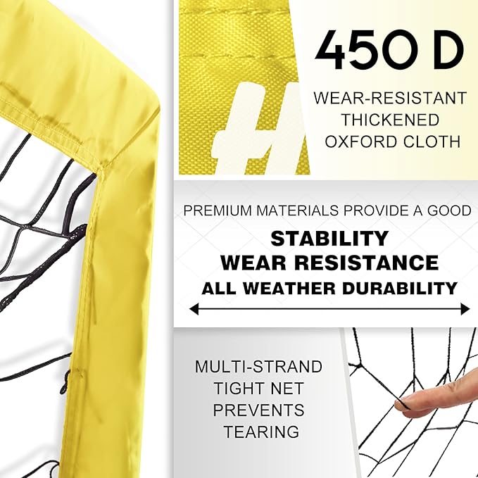 - 【Long-lasting Thickened Material】 The soccer goal is made of 450D thickened oxford cloth, 10mm high elastic fiberglass pole and strong 3-layer polyester soccer net. This ensures exceptional performance even against powerful shots, maintaining its all-weather durability and it won't fade or wear even if it is placed outdoor for a long time.