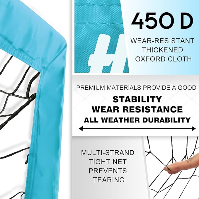 - 【Long-lasting Thickened Material】 The soccer goal is made of 450D thickened oxford cloth, 12mm high elastic fiberglass pole and strong 3-layer polyester soccer net. This ensures exceptional performance even against powerful shots, maintaining its all-weather durability and it won't fade or wear even if it is placed outdoor for a long time.
