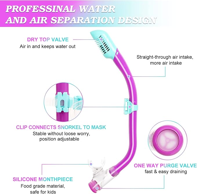 - 【DRY TOP SNORKEL & PURGE VALVE】The Snorkel adopts the most stable dry float valve design. When immersed in water, the top float valve will close automatically to prevent water from entering the breathing tube, the lower purge valve can quickly drain water, so that children will not be choked by water. Food grade soft liquid silicone mouthpiece is durable and safe for children to use.