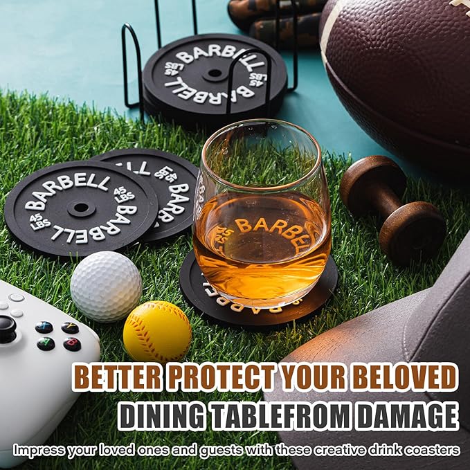 - Eye Catching And Inventive Design: the barbell coasters with astonishing gym inspired pattern enhances the aesthetics of your living space, the regular coaster design has been revamped with an ingenious barbell plate design, which is a nice but perfect gym decoration